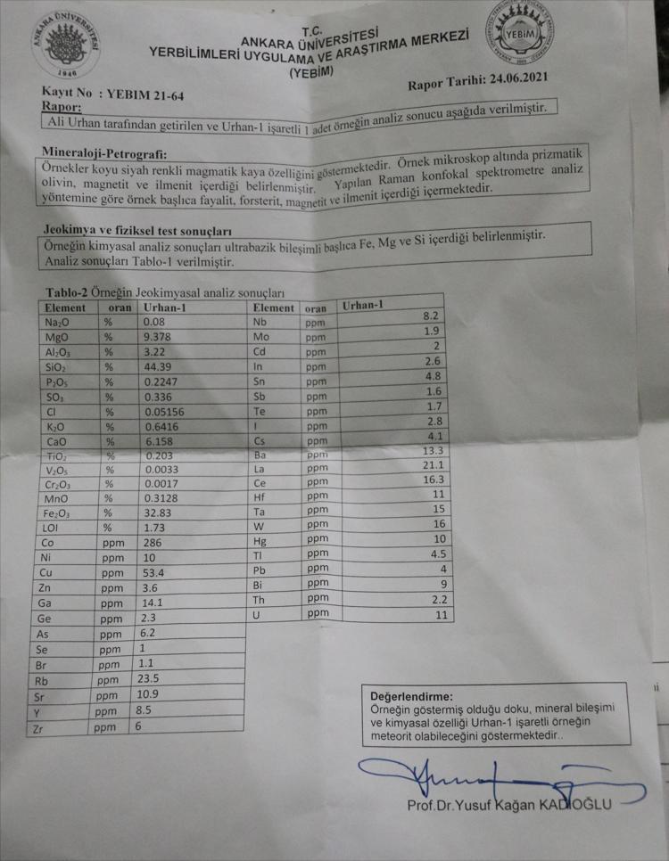 Urhan, taş parçalarından örnek alıp, YEBİM'e götürdü. Merkezde Prof. Dr. Yusuf Kaan Kadıoğlu ve ekibi tarafından taş örneklerinin yapılan incelemesinde 49 ayrı element taşıdığı ve meteorit olabileceği tespit edildi.