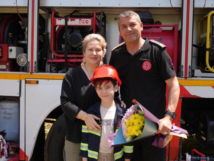 Düzce Belediyesi İtfaiye Müdürlüğü'nde görevli personele, gittikleri yangın tatbikatında Babalar Günü sürprizi düzenlendi. Senaryo gereği mahsur kalan kişiyi kurtarmak için girdikleri binada, itfaiyeci kıyafeti giymiş çocuklarını ellerinde çiçekleriyle gören itfaiye personeli, duygu dolu anlar yaşadı.