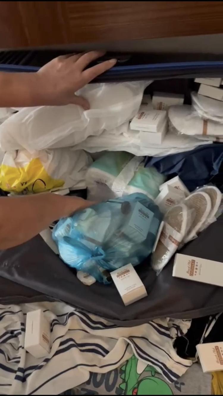 Bunun üzerine otel personeli ailenin bavullarını kontrol etti. Bavulların içi tamamen otel ürünleri ile doldurulmuş halde bulunurken aramada, şampuan, sabun, bez terlik, kapalı tek porsiyonluk reçel, bal ve lokum gibi çok sayıda otele ait ürün çıktı.