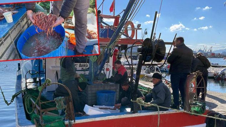 Balıkçılar, günün ilk ışıklarıyla limana dönmeye başladı. Dönen teknelerde balıkçıların ağlarına takılan kilolarca karides, kasalarla limana indirildi.