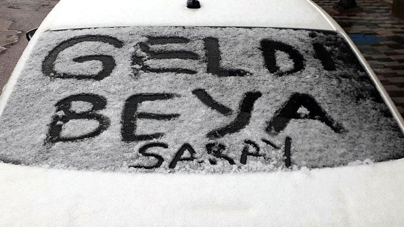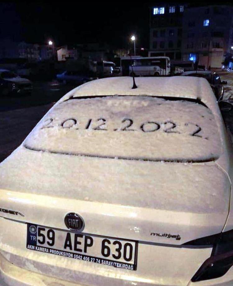 Bir otomobilin üzerine Trakya şivesiyle, ‘Geldi beya’ yazıldığı görüldü.