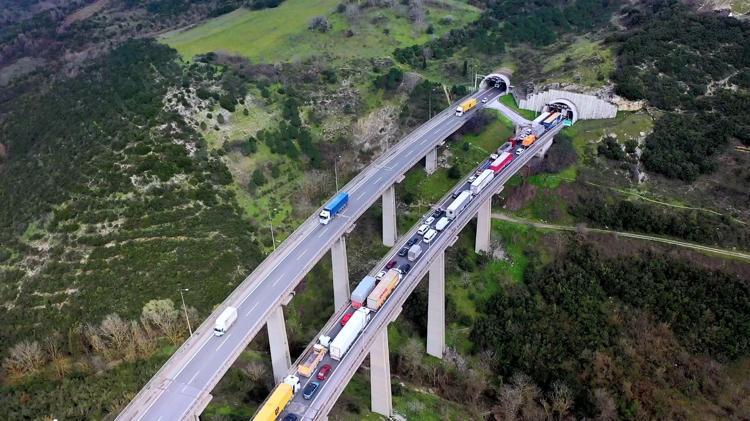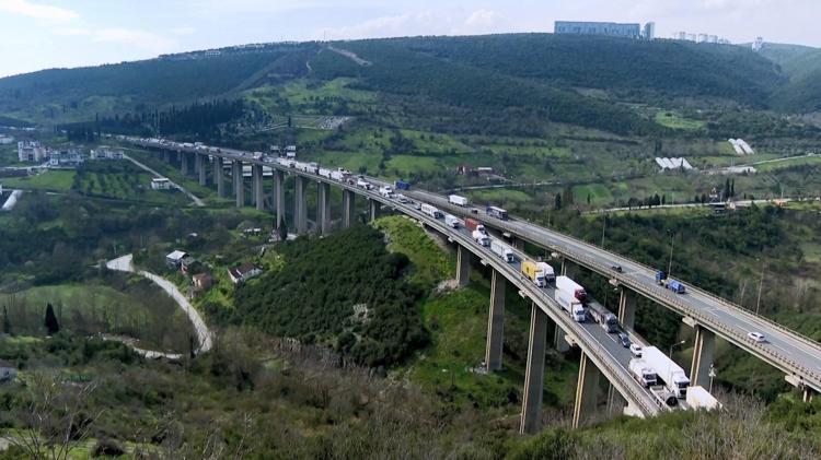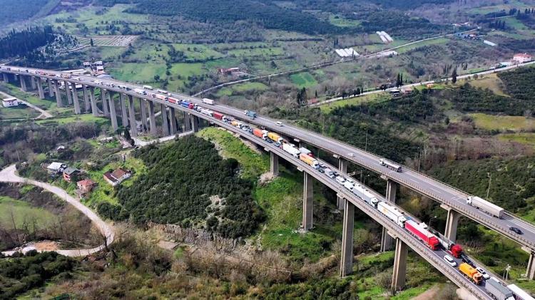 TEM’de 2 TIR ve 2 otomobil çarpıştı; araç kuyruğu dron kamerasında