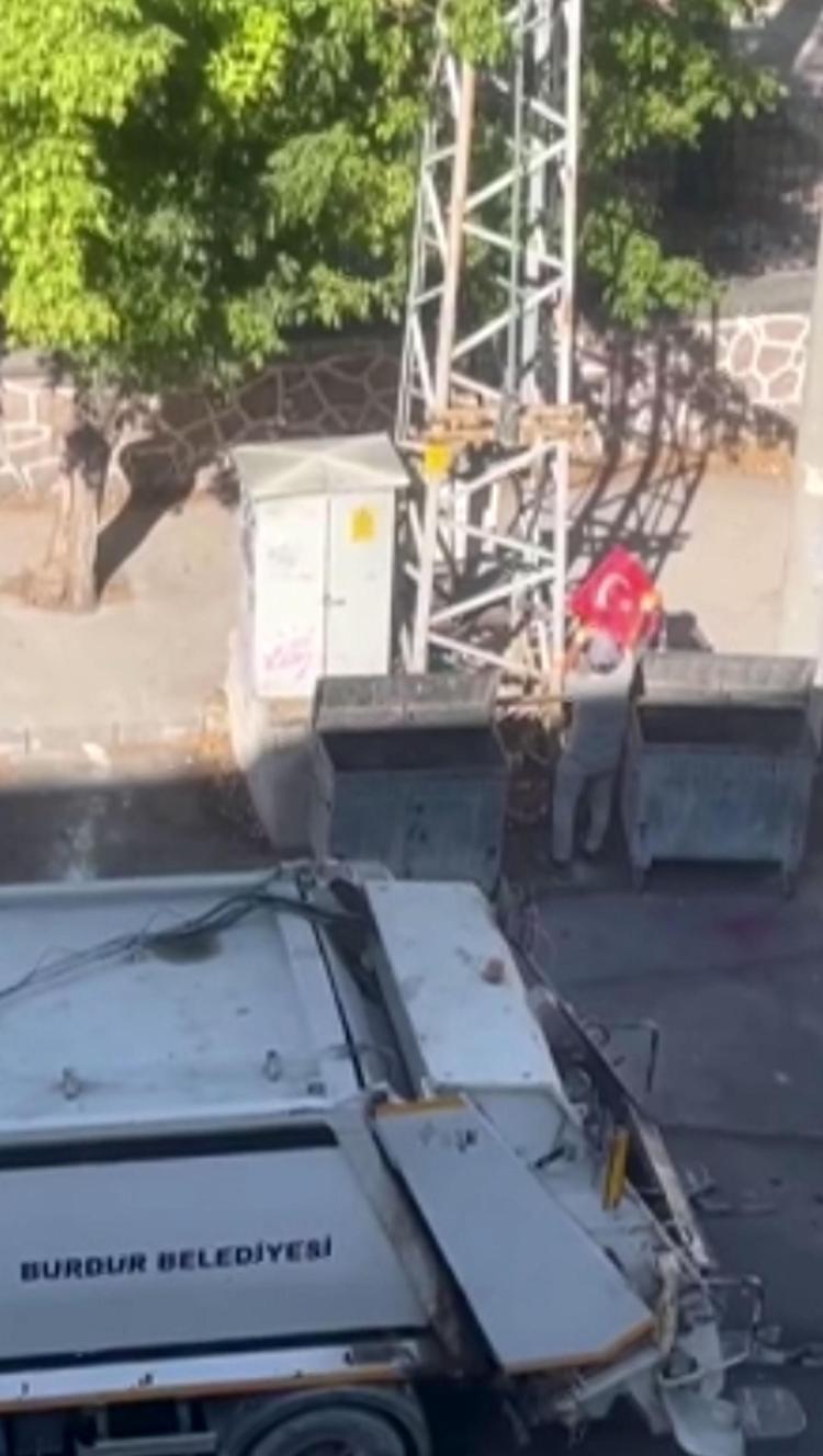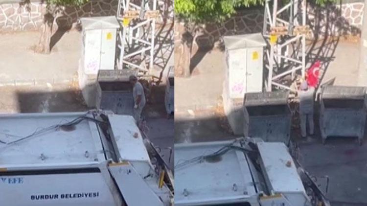 Görüntüyü paylaşan vatandaş, "Çöp konteynerine atılmış bayrağımızı özenerek alıp direğe asan Burdur Belediyesi temizlik işçisi kardeşimi kutluyorum. Onu konteynere atan sorumsuzları ise kınıyorum. Bu vatan kuponla alınmadı. O bayrağın kızıl rengi bu vatan için canını veren şehitlerimizin kanıyla boyandı" ifadelerini kullandı.