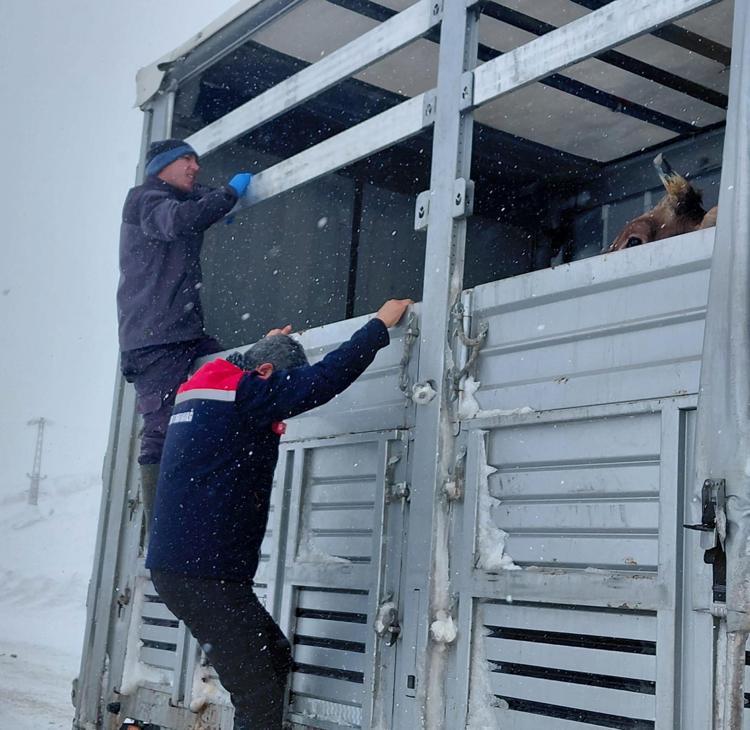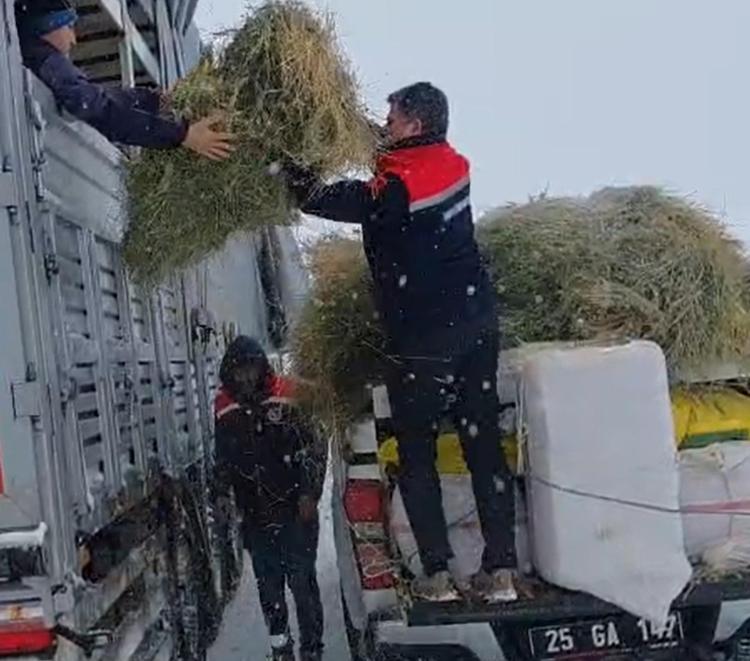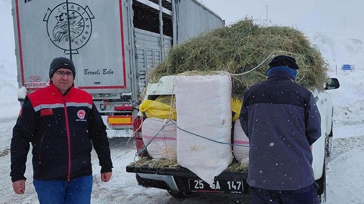 Erzurum’un Çat ilçesinde Tarım ve Orman Müdürlüğü ekipleri, kar ve tipi yüzünden yolda mahsur kalan TIR’daki büyükbaş hayvanlara ot ve saman taşıdı. İş makinesiyle kurtarılan TIR yoluna devam etti.