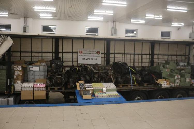 Plastik duvar kaplamaları taşıdığı beyan edilen TIR'da, resmi yük ile gerçekte taşınan yükün örtüşmediği ortaya çıktı. Yapılan aramada 22 bin 550 elektronik sigara ve 250 elektronik sigara likidi, şanzıman, TIR motoru, üst silindir kapağı, diferansiyel ve soğutucudan oluşan 68 otomotiv yedek parçasına el konuldu.