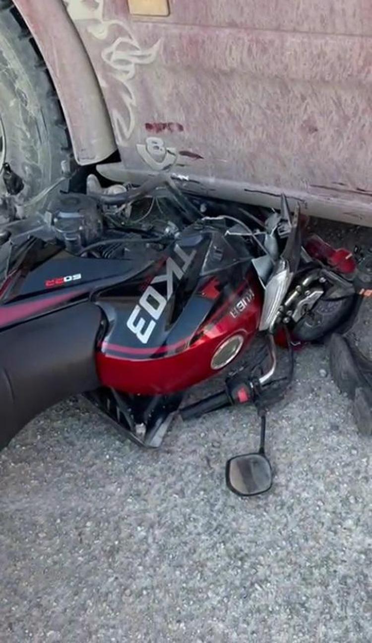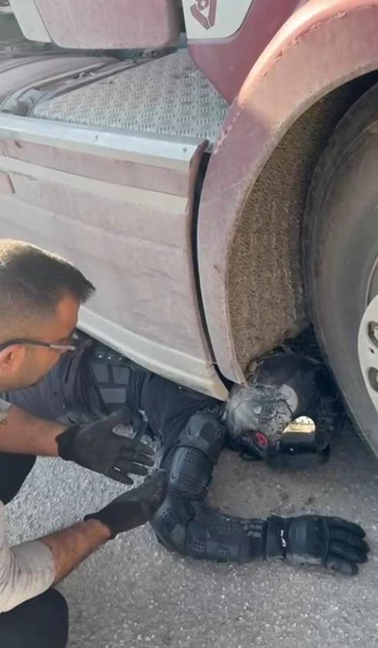 TIR'ın altında sıkışan motosikletin sürücüsünü kaskı ve koruyucu kıyafetleri kurtardı