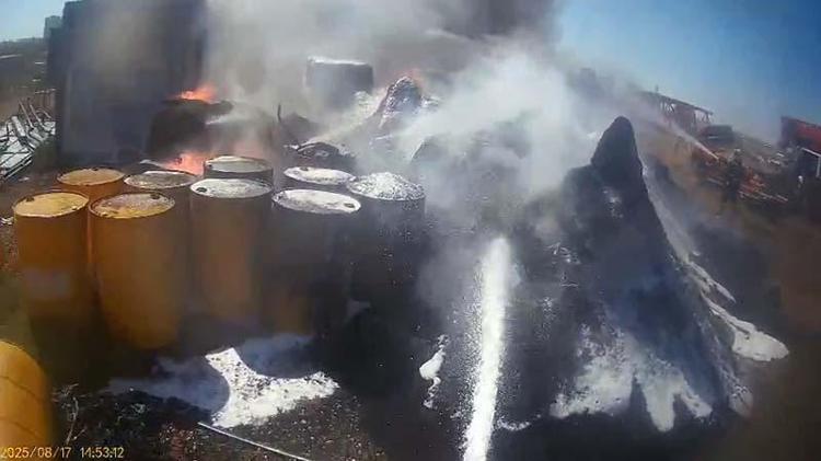 Diyarbakır’ın Yenişehir ilçesinde depo olarak kullanılan bahçede çıkan yangında 30 ton kauçuk, 14 varil zemin yapıştırıcısı yanarken, 1 konteyner ve 1 kulübe kullanılamaz hale geldi.