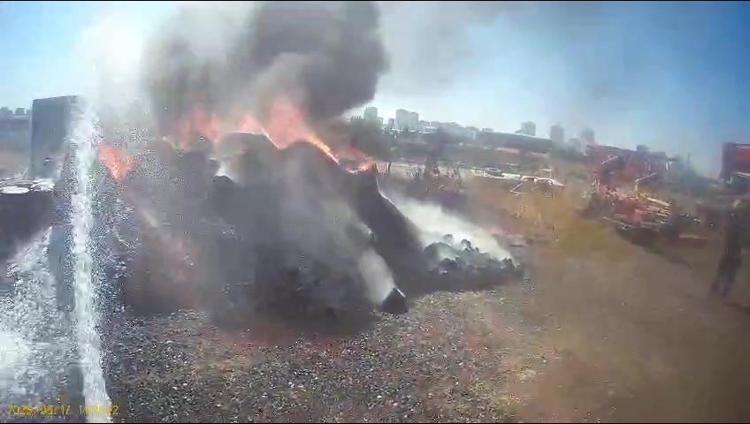 Yenişehir ilçesi Üçkuyu Mahallesi’nde depo olarak kullanılan bahçede öğle saatlerinde yangın çıktı. Alevler kısa sürede büyüyerek kauçukların bulunduğu alana ardından da konteyner, kulübe ve zemin yapıştırıcısının bulunduğu varillere sıçradı. Çevredekilerin ihbarı üzerine bölgeye itfaiye, sağlık ve polis ekipleri sevk edildi. İtfaiye ekiplerinin müdahalesiyle yangın kontrol alınarak, söndürülürdü. İtfaiye ekiplerinin yangına müdahalesi ise kask kamerasına yansıdı. Yangında 30 ton kauçuk, 14 varil zemin yapıştırıcı yanarken, konteyner ve kulübe kullanılamaz hale geldi.