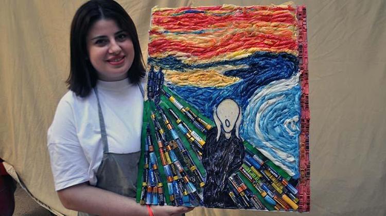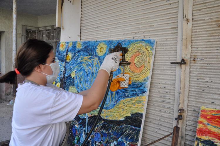 Hatay'ın Reyhanlı ilçesinde üniversite öğrencisi Dilara Altınorak Matracı (24), topladığı atık malzemeler ile ünlü ressamların tablolarını yapıyor.