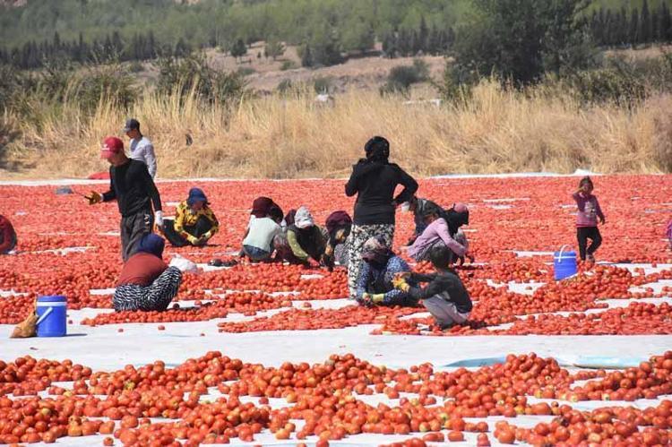Domateslerin kurutma işleminde görev alan Halit Çoban, "6-7 günde domatesler kurutuluyor ve firmalara gönderiliyor. Buradaki işçilerimiz dışarıdan geliyor. Kesim gün boyu devam ediyor. Kesimden sonra ilaçlama işlemi ile domatesler kurutmaya bırakılıyor. Rüzgarlı havalarda domates daha erken kuruyor. Çok rüzgar olduğu zaman da sergiye zarar veriyor. İdeal hava koşullarının oluşması lazım. Zahmetli ve masraflı bir iş. Herkes elinden geleni yapmaya çalışıyor" diye konuştu.