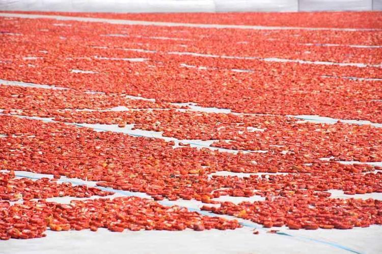 Torbalı ilçesinde 21 bin hektarlık alanda yetiştirilen domatesler, oluşturulan sergilerde kurutulup, fabrikalarda işlenerek ihraç ediliyor. Nisanda ekimi yapılan domatesler, önce hasat ediliyor, temmuz ve ağustos aylarında ise kurutma işleminden geçiriliyor. Türkiye'de kurutulmuş domates ihracatının 3'te 2'sinin yapıldığı Torbalı'da ilaçlanan domatesler, kesilerek kavurucu sıcakta kurumaya bırakılıyor. Uygun nem oranı, güneş açısı ve rüzgarın da etkisiyle 6-7 gün içinde kuruyan domatesler, ABD ve Almanya ile Belçika dahil 100'e yakın ülkeye ihraç ediliyor.