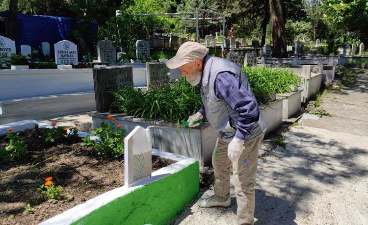 "Her gün sabah gelip akÅŸam gidiyorum buradan. Kimsesi olmayan mezarlara bakıyorum. Yazılarını yazıyorum, boyasını yapıyorum. Toprağını dolduruyorum. Her  iÅŸi gönüllü olarak yapıyorum. Â