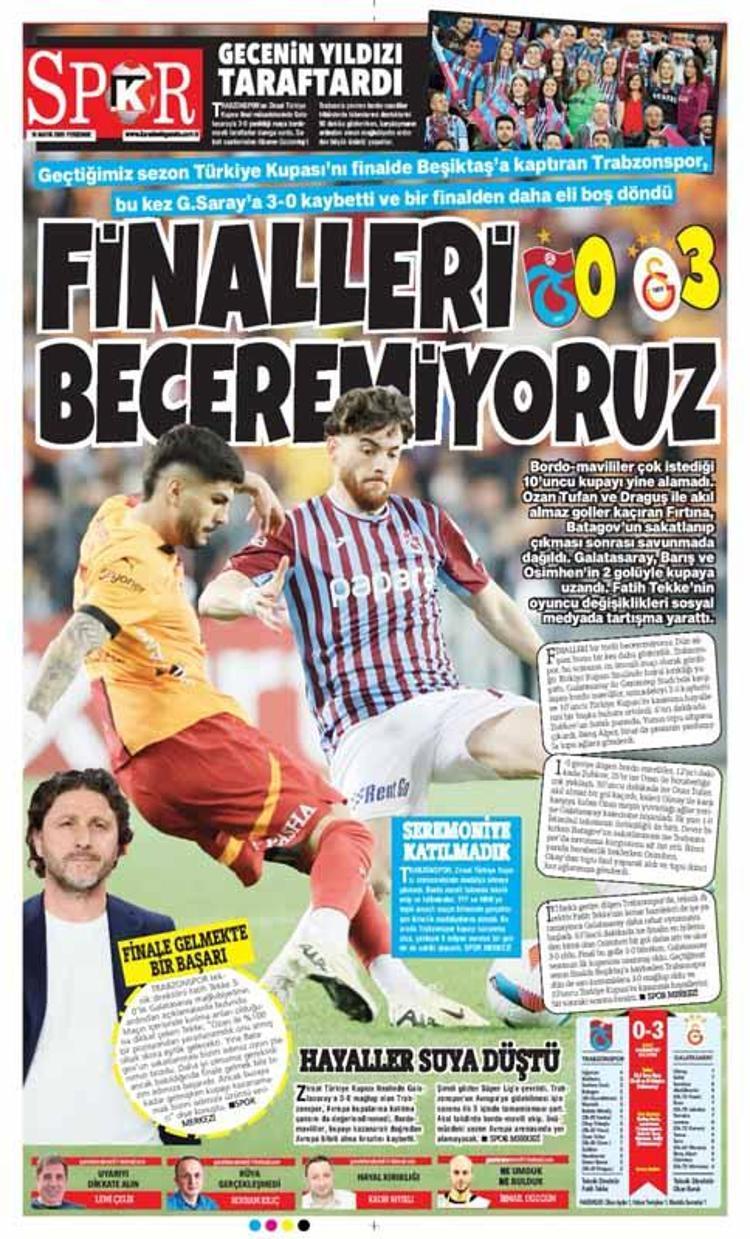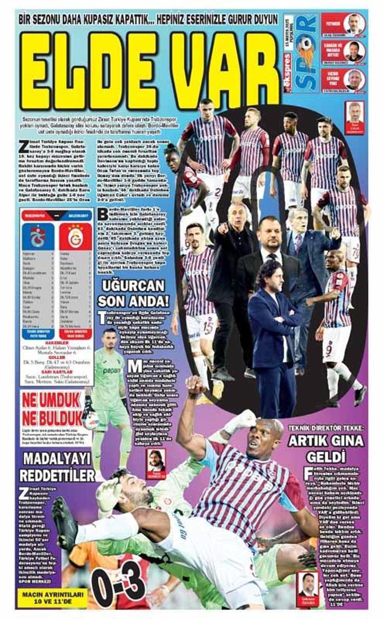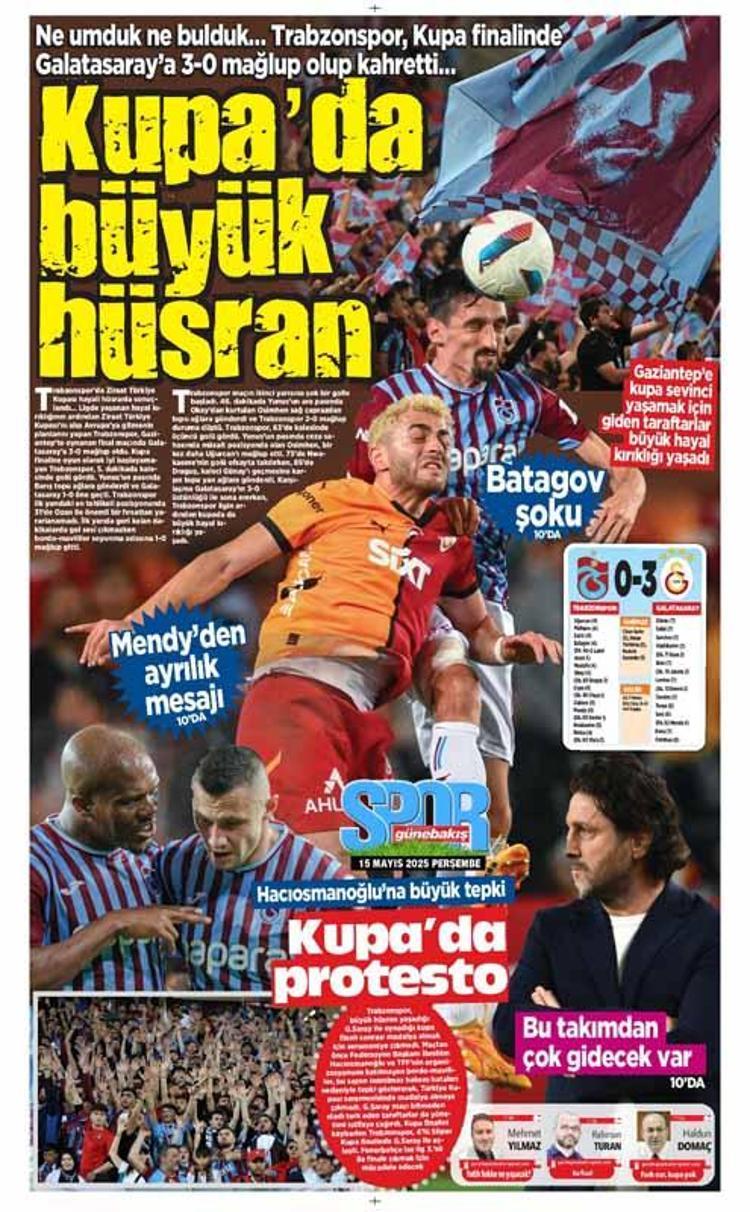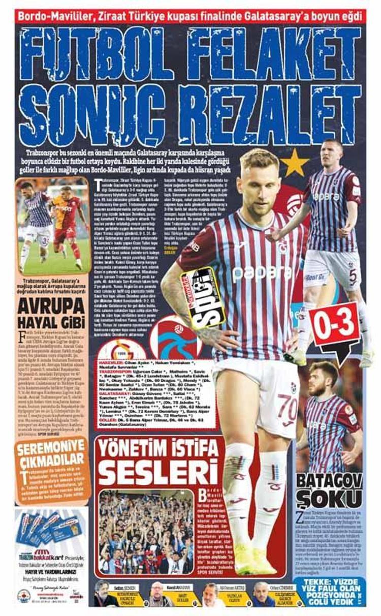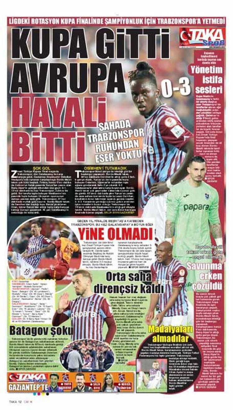 Öte yandan Trabzon’da yayın yapan yerel gazeteler de bordo-mavili takımın Galatasaray’a finalde mağlup olarak kupayı kazanamamasını farklı başlıklarla manşetlerine taşıdı.