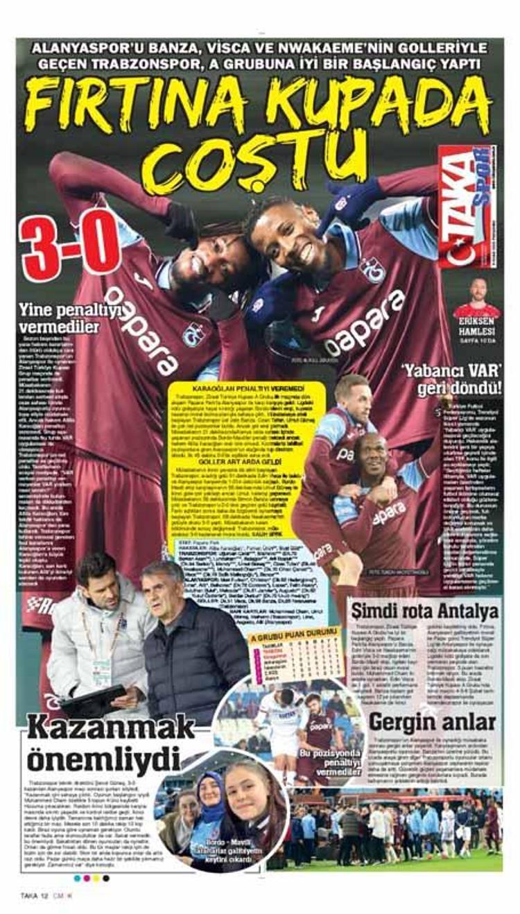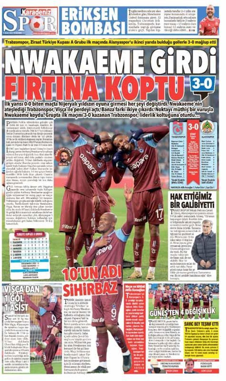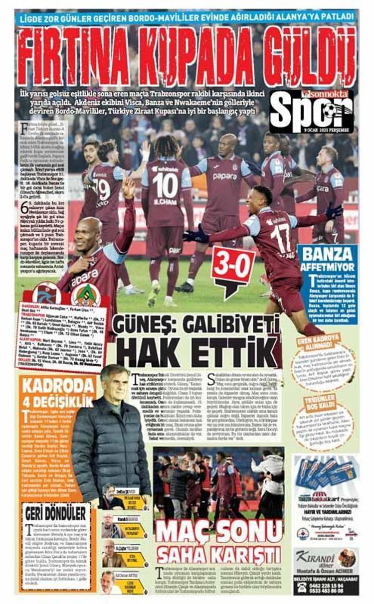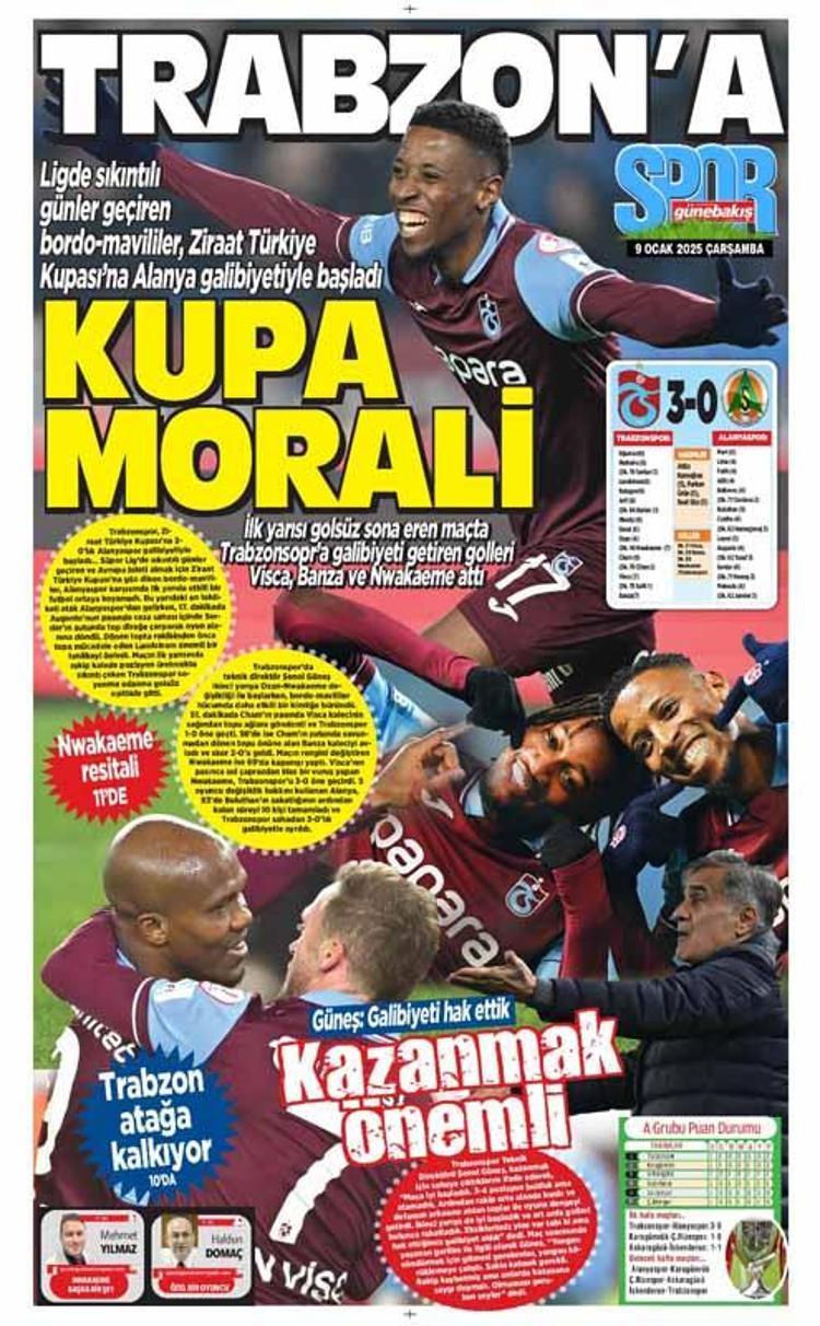Öte yandan kentte yayın yapan yerel basın, bordo-mavili takımın Kupa’da aldığı galibiyeti farklı başlıklarla manşetlerine taşıdı.