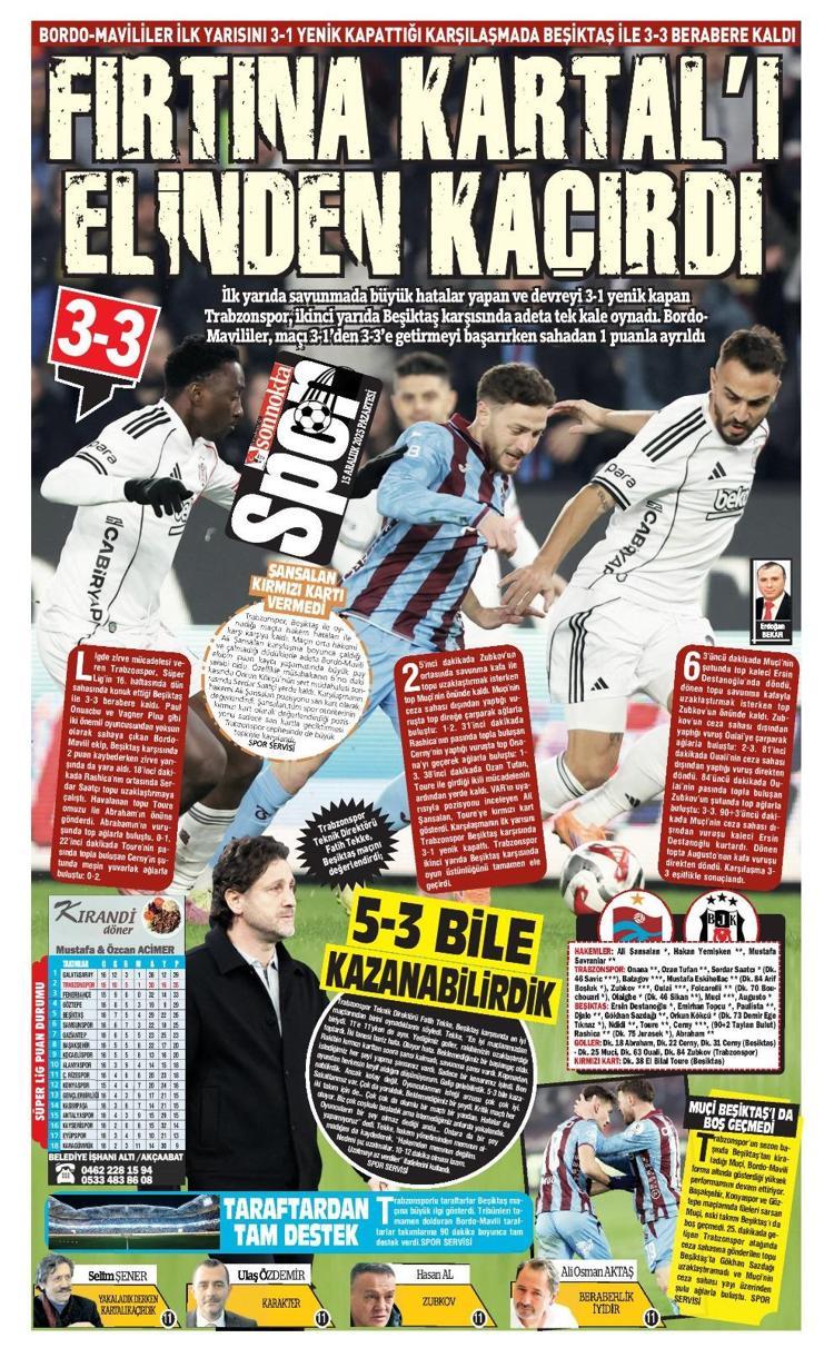 Öte yandan Trabzon’da yayın yapan yerel gazeteler, Beşiktaş karşısında 2 farklı geriden gelinerek alınan beraberliği manşetlerine taşıdı. Yerel basında öne çıkan başlıklar şu şekilde: