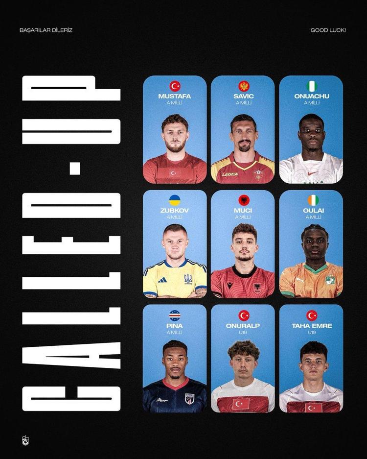 Trabzonspor’dan A Milli Takım düzeyinde Türkiye, Karadağ, Nijerya, Ukrayna, Arnavutluk, Fildişi Sahili ve Yeşil Burun Adaları’na oyuncu gönderilirken, genç milli takımlarda da iki isim kadroya çağrıldı. Türkiye A Milli Takımı’na Mustafa Eskihellaç davet edilirken, Karadağ Milli Takımı’na Stefan Savic, Nijerya Milli Takımı’na Paul Onuachu çağrıldı. Ukrayna Milli Takımı’nda Oleksandr Zubkov yer alırken, Arnavutluk Milli Takımı kadrosunda Ernest Muçi bulunuyor. Fildişi Sahili Milli Takımı’na Christ Inao Oulai davet edilirken, Yeşil Burun Adaları Milli Takımı’nda ise Pina görev yapacak.