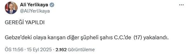İçişleri Bakanı Ali Yerlikaya, olayla ilgili sosyal medya hesabından açıklama yaptı. Bakan Yerlikaya, "Kocaeli'nin Gebze ilçesinde; sokakta aşırı hız yapan sürücüyü uyaran babaya, okula götürdüğü çocuklarının gözü önünde tokat atan şüphelinin O.C. (33) olduğu tespit edilmiştir. Kocaeli Emniyet Müdürlüğümüzün yaptığı çalışmalar sonrası şüpheli İstanbul'da yakalanmıştır.