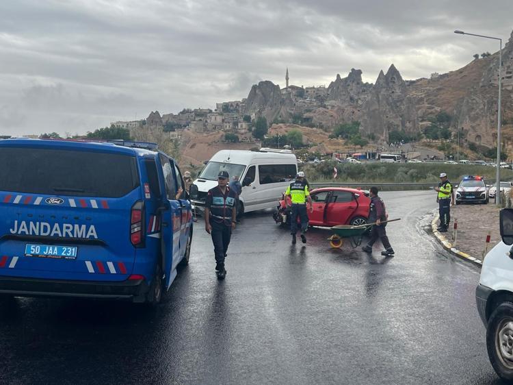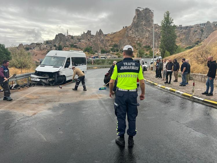 Kaza, saat 09.30 sıralarında Uçhisar-Göreme kara yolu Cevizlibağ mevkiinde meydana geldi. Turistleri taşıyan Cemal K. yönetimindeki 50 US 707 plakalı minibüs ile sürücüsü henüz öğrenilemeyen 50 AEJ 140 plakalı otomobil çarpıştı. Kazada iki araçta bulunan 6 kişi yaralandı. Çevredekilerin ihbarı üzerine kaza yerine jandarma ve sağlık ekipleri sevk edildi. Yaralılar, ambulanslarla Nevşehir Devlet Hastanesi’ne kaldırılarak tedaviye alındı.