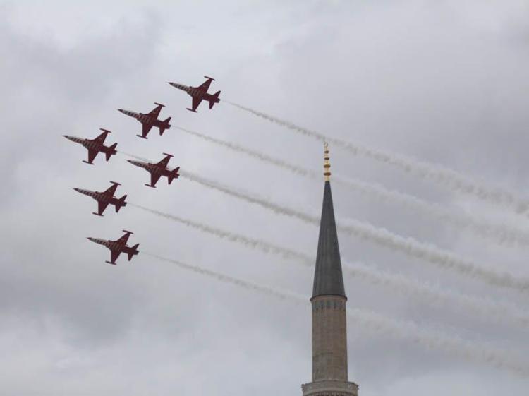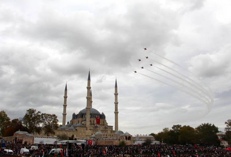 Edirne’de, 29 Ekim Cumhuriyet Bayramı kutlamaları kapsamında, Türk Hava Kuvvetleri’nin Türk Yıldızları ekibi, gösteri uçuşu yaptı. Gösteri için vatandaşlar, Edirne’nin simgesi, UNESCO İnsanlığın Somut Olmayan Kültürel Mirası Listesi’ndeki Selimiye Camisi meydanında toplandı.