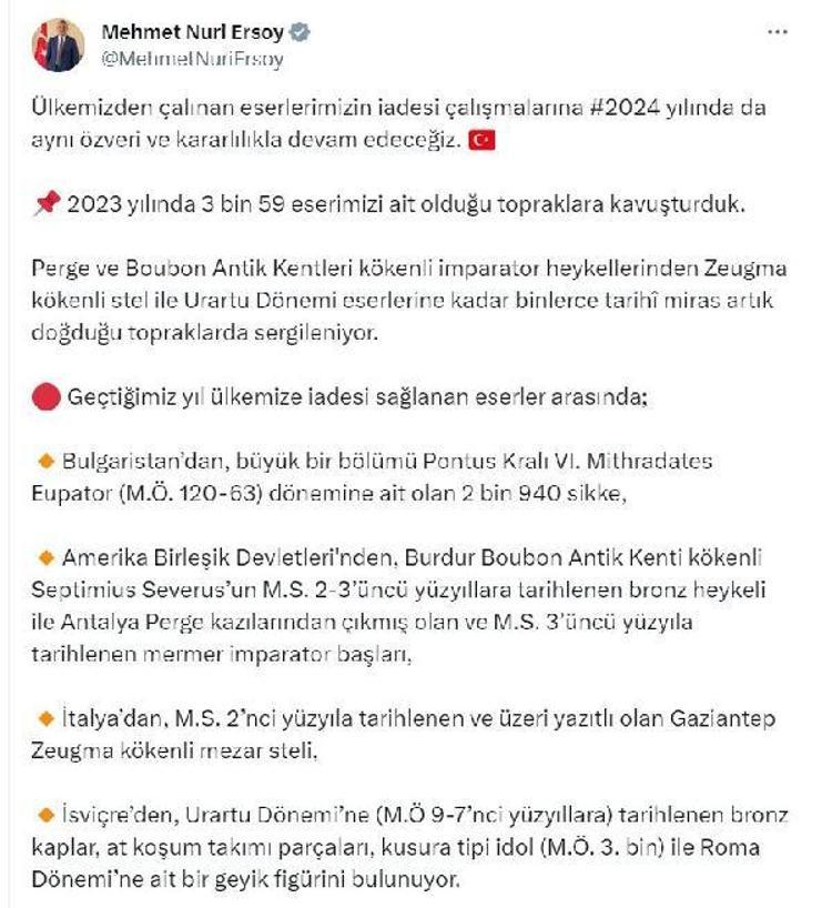 Ersoy, geçen yıl Türkiye'ye iadesi sağlanan eserlere ilişkin şu bilgileri paylaştı: