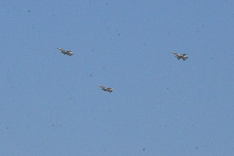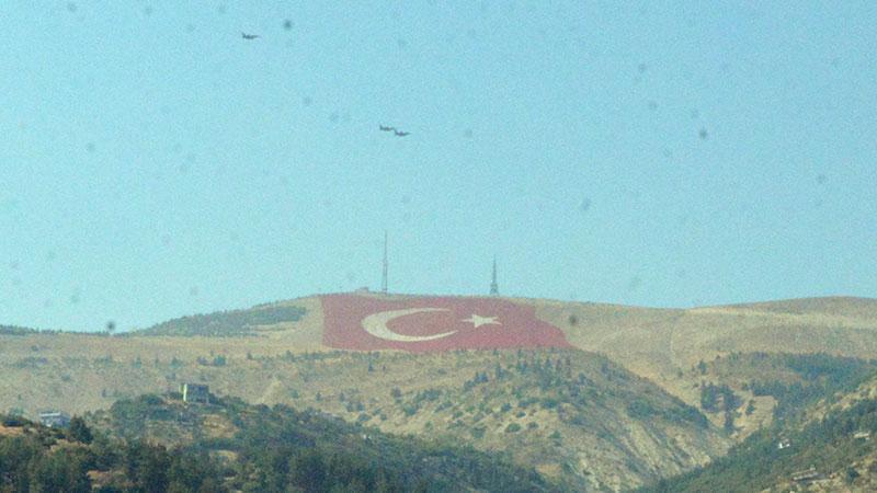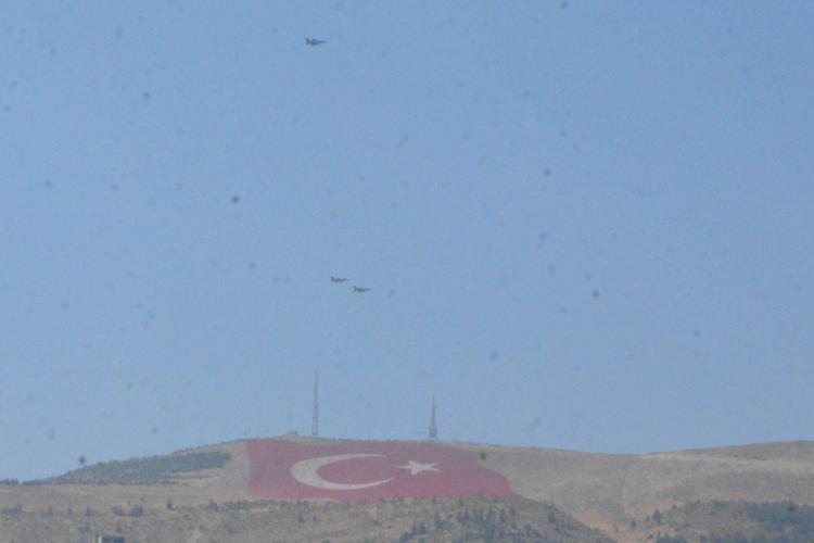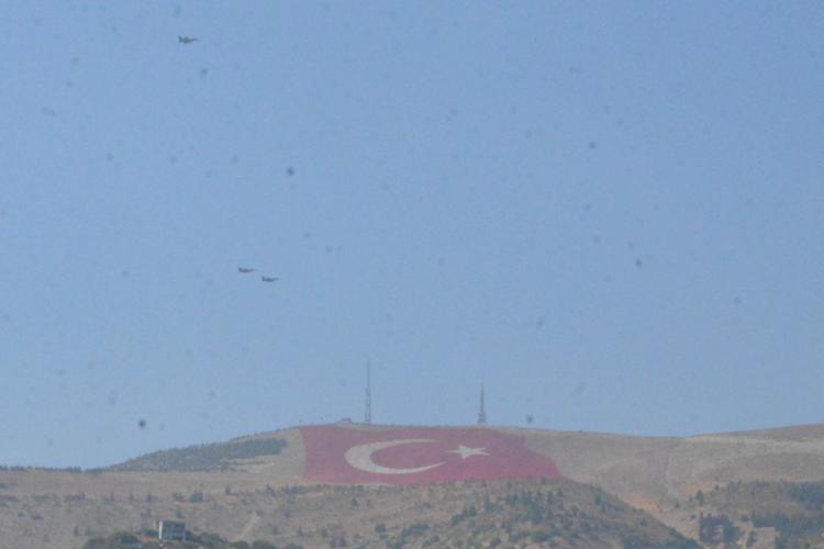 40 bin metrekarelik alana işlenerek doğaya işlenmiş en büyük Türk bayrağını ilk selamlayanlar, Türk Hava Kuvvetleri'nin 'Savaşan Şahinler Filosu' oldu. Adana'da bulunan İncirlik Hava Üssü'nden kalkan 3 F-16 savaş uçağı, yaptığı gösteri uçuşuna dev Türk bayrağını selamlayarak başladı. Filodaki uçaklar, daha sonra Madalyalı Kavşak, EXPO, Abdülhamid Han Camisi ile merkez spor kompleksi stadyumu üzerinden uçarak halkı selamladı. Savaşan Şahinler Filosu'nun gösterisi ilgiyle takip edildi.