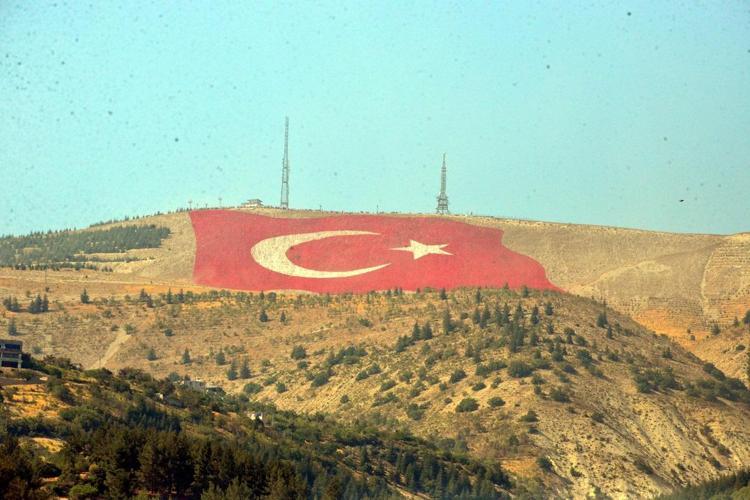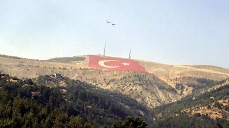 Kahramanmaraş'ta Ahır Dağı zirvesine işlenen 40 bin metrekarelik en büyük Türk bayrağı, Büyük Taarruz'un 103'üncü yıl dönümünde tamamlandı. En büyük bayrağı, ilk olarak Türk Hava Kuvvetleri'nin 'Savaşan Şahinler Filosu' selamladı.