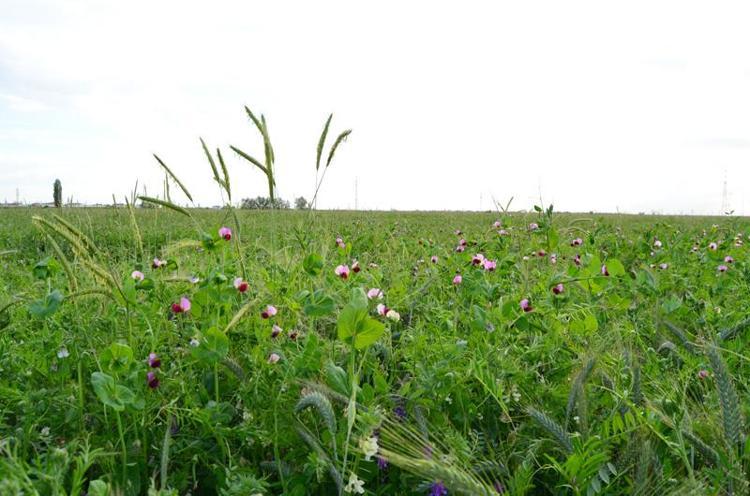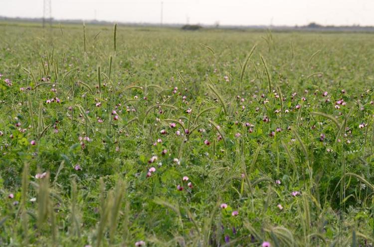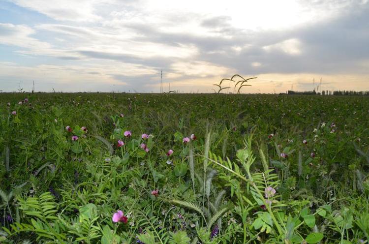 Burada yem bitkisi ihtiyacını karşılamak için yoğunlukla yonca ve silajlık mısır tarımı yapılıyor. Burada çiftçimize önerdiğimiz 4'lü karışımda yem bezelyesi, Macar fiğ, tritikale ve yulaf karışımı var. Bunun yüzde 70'i bakla bitkisi, yüzde 30'u da buğdaygiller. Ürünlerin boyu 1 metre 80 santime kadar yükselmekte. Burada bizim asıl amacımız, az suyla daha kaliteli yem bitkisi üretimini sağlamak.