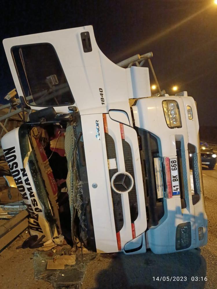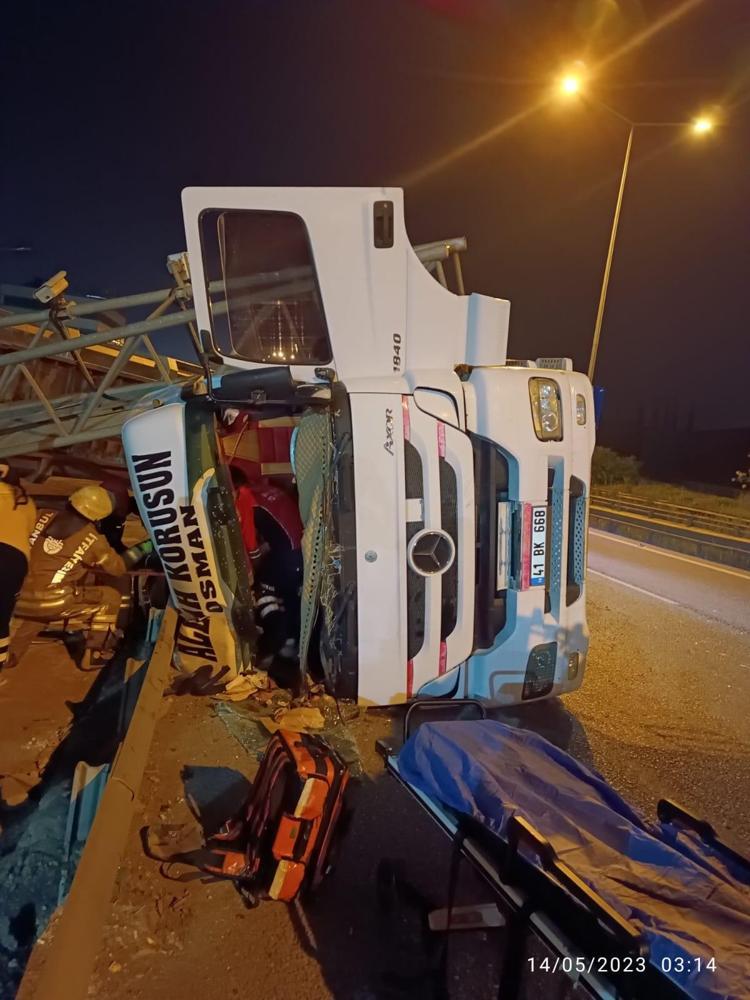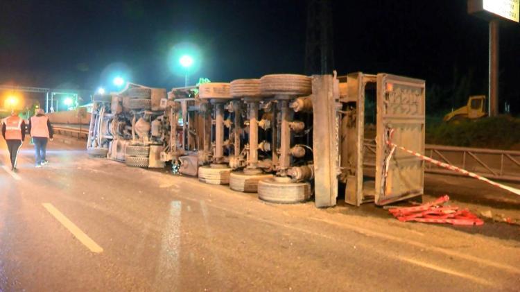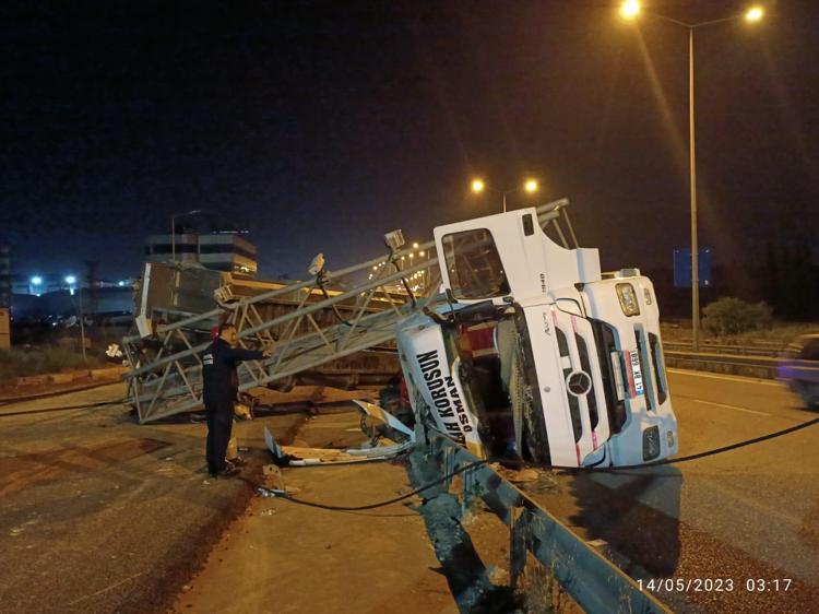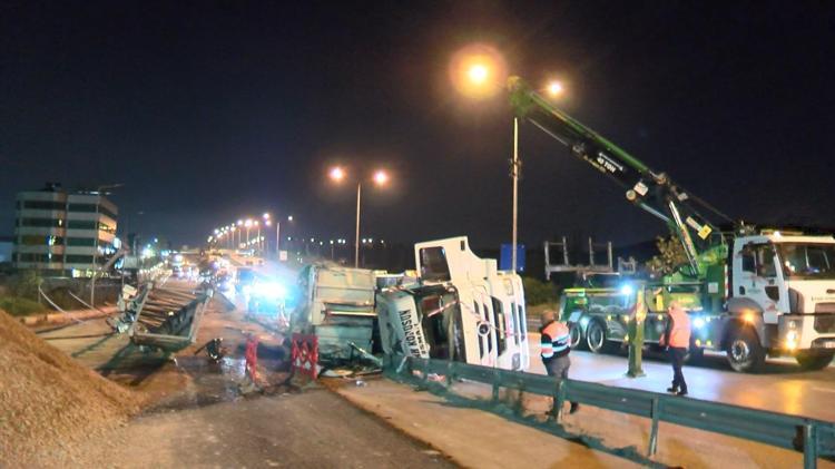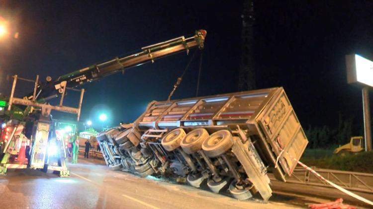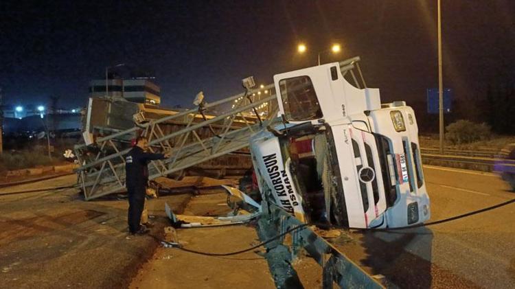 Tuzla'da damperi açık ilerleyen TIR kamera platformuna takılarak devrildi