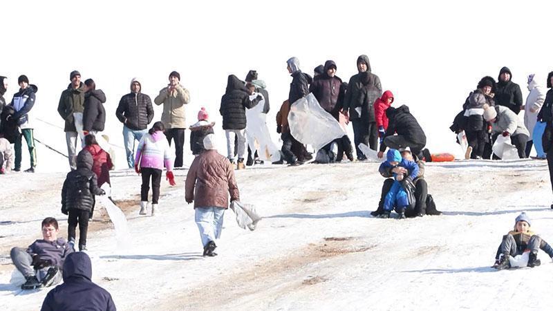 Vatandaşlar ellerindeki şişme botlarla, tepsilerle, leğenlerle, poşetlerle, tahtadan yaptıkları kızaklarla kayarak karın keyfini çıkardı.