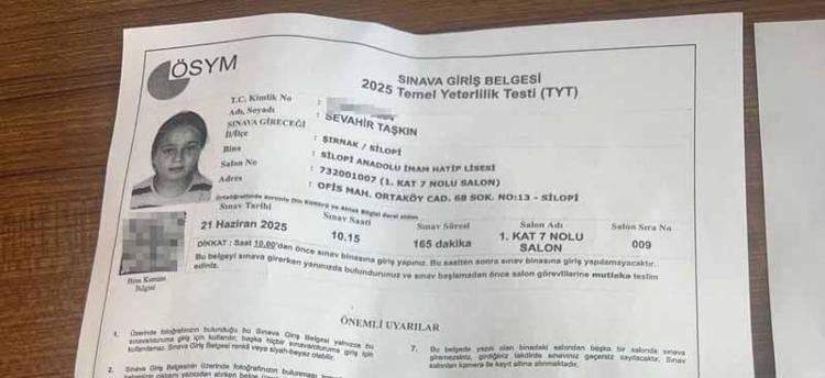 Silopi ilçesinde lise son öğrencisi Sevahir Taşkın (18), 21 Haziran'da yapılan Yükseköğretim Kurumları Sınavı (YKS) ilk oturumu olan TYT'ye girdiği okulun yanlış olduğunu, sınav kitapçığında başka bir kişinin ismini görünce fark etti. Taşkın sınıftan çıkarıldı ve sınava girmesi gereken okula, saat 10.00'u geçtiği için alınmadı. Görevlilerin kontrolünden geçerek içeri girdiği, görevlilerin de okulun yanlış olduğunu uyarmadığını belirten Sevahir Taşkın, savcılığa başvurarak sorumlular hakkında şikayetçi oldu.