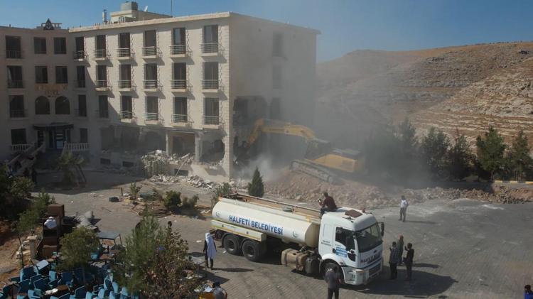 Şanlıurfa'nın Halfeti ilçesinde mimari yapıyla uyuşmadığı gerekçesiyle yıkılmasına karar verilen ve 'ucube' olarak nitelendirilen 4 katlı, 3 yıldızlı otel, iş makinesiyle 23 saniyede yıkıldı.