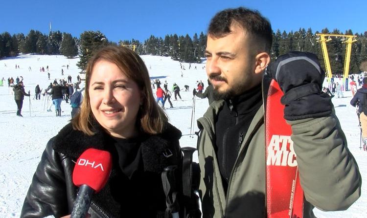 Hafta sonu tatili için eşi ile birlikte geldiği Uludağ’ı çok beğendiğini söyleyen Gizem Bedir, “Kısa bir mola verelim dedik. Mağazacıyız ikimiz de gerçekten yoğun çalışıyoruz. Onun arasında ufak bir kaçamak yapalım dedik eşimle. İlk kez geliyoruz, beklediğimize göre hava çok güzel. Baya sıcak. Kayak çok yapamadık. Biz yapamadık, zor oldu baya” derken, eşi Batuhan Bedir, “Kayak yapmayı deniyoruz. Pes etmek yok. Uludağ çok güzel, İzmir’e göre farklı” diye konuştu.