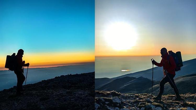 Yürüyüşlerine devam eden dağcılar, saat 05.00’da ise 2 bin 543 metre yüksekliğindeki zirveye ulaştı. Dağcılar burada da güneşin doğuşuna tanıklık etti. Gün ağarırken, gökyüzünde oluşan renk şölenini fotoğraflayan dağcılar, ayın batışı ile güneşin doğuşunu da aynı anda görüntüledi.
