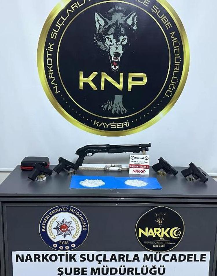 Yapılan aramalarda gizli bölmede 70 gram metamfetamin, 4 tabanca, tüfek, 'suikast silahı' olarak bilinen kalem şeklinde tabanca ve 69 adet fişek ele geçirildi.