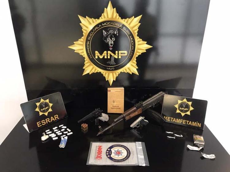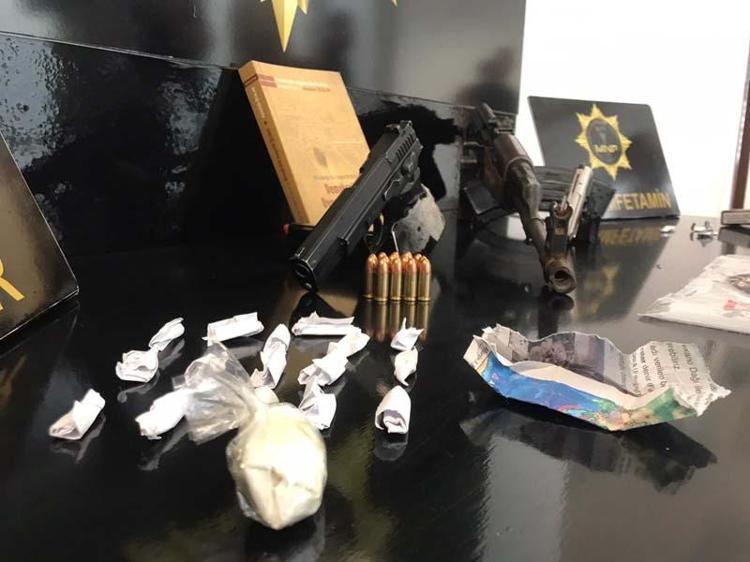 Şüphelilerin adreslerindeki aramalarda 2 Kalaşnikof piyade tüfeği, bu silaha ait 87 fişek, 5 ruhsatsız tabanca ile 4 şarjör ve 38 fişek, toplam 31,67 gram esrar, 17,03 gram metamfetamin, 1,84 gram sentetik uyuşturucu (bonzai) maddesi ve PKK terör örgütüne ait kitap ele geçirildi.