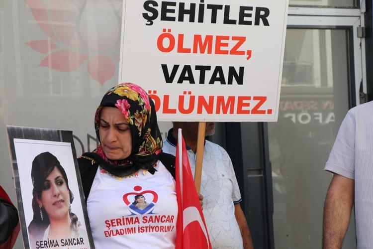 Eyleme 8 yıl önce kaçırılan oğlu Yunus için katılan Gülsen Alkan, "Oğlum, 8 yıl önce kandırılarak dağa götürüldü. Gözlerim yolda, oğlumu istiyorum. Bu hasta halimle eyleme katılıyorum.