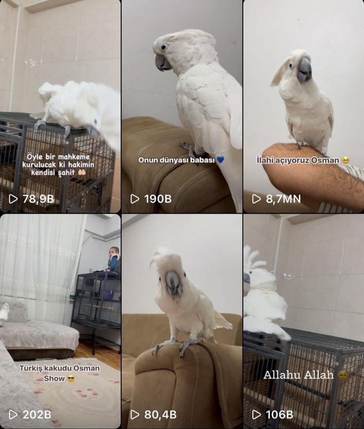 Bursa'da sahibinin görüntülerini sosyal medyada paylaştığı 5 yaşındaki 'Osman' adını verdiği papağanın videoları, 30 milyon izlenmeye ulaşırken, en çok da ilahi videoları dikkat çekiyor. Yavruyken aldığı ve dedesinin ismini verdiği 'Umbrella Kakadu' cinsi papağanının ilahi duyduğunda adeta kendinden geçtiğini, kanatlarını açıp, başını salladığını söyleyen Rahim Çakmak (35), “İlahiyi duyunca kendinden geçiyor Osman. O yüzden keşfedildi. Videoları daha çok izlendi” dedi.