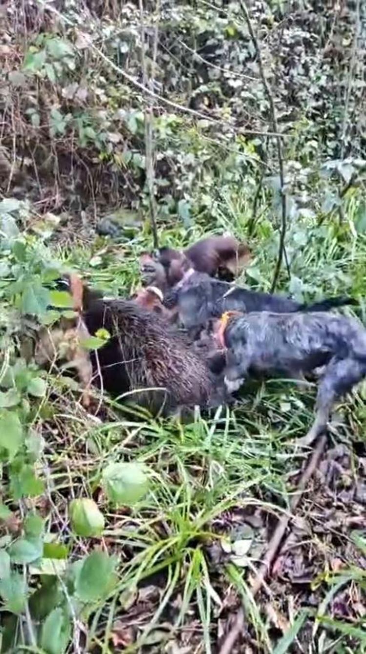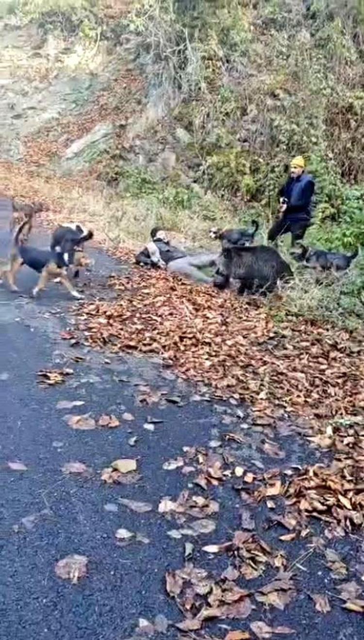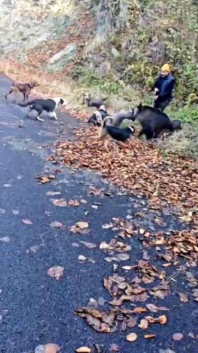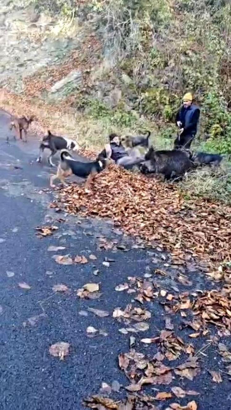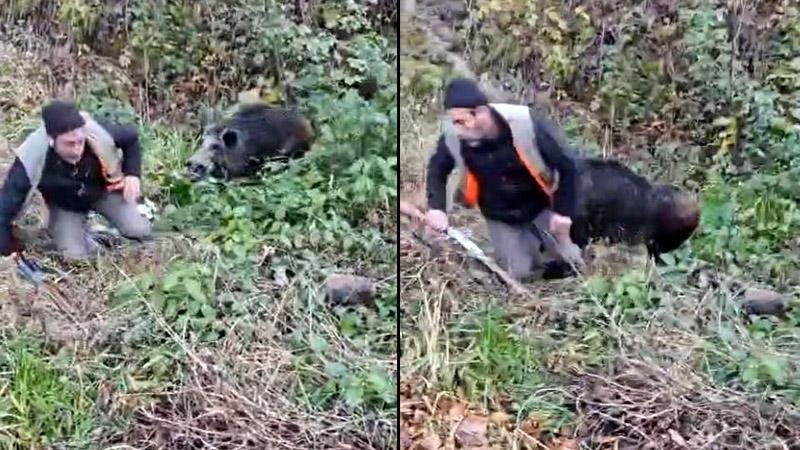 Trabzon'da ormanda ava çıkan avcılar, vurdukları yaban domuzunun saldırısına uğradı. O anlar, cep telefonu kamerasına yansıdı.