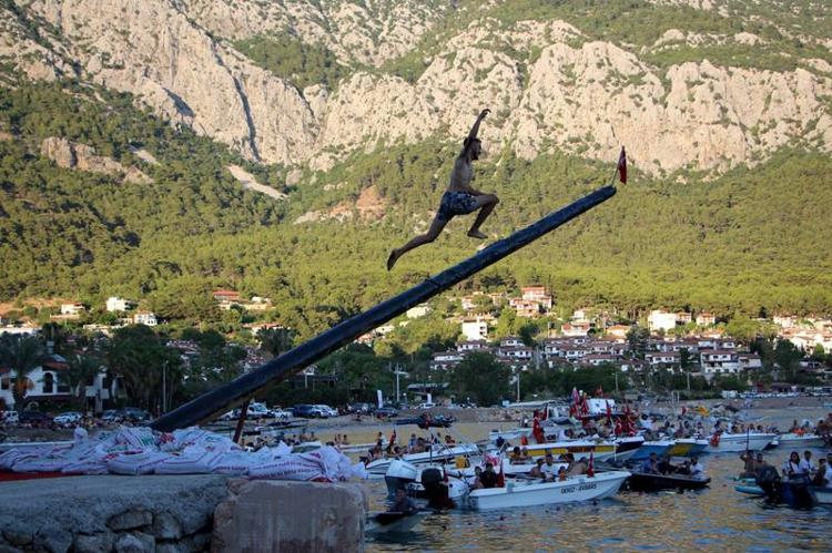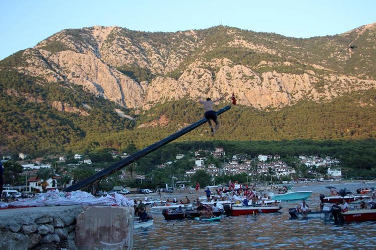Antalya'nın Kumluca ilçesinde bu yıl 34'üncüsü düzenlenen Karaöz Denizcilik ve Kabotaj Bayramı etkinliklerinde; yağlı direkten bayrağı alma yarışması yoğun ilgi gördü. Bayrak alma mücadelesinde bazıları düşüp yaralanırken, yarışı 9'uncu kez Hasan Çüm kazandı.