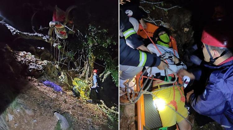 Ekipler bulun üzerine sedyeye bağlanan yaralı Rus vatandaşını halat yardımı ile uçurumdan indirmek için çalışma başlattı.