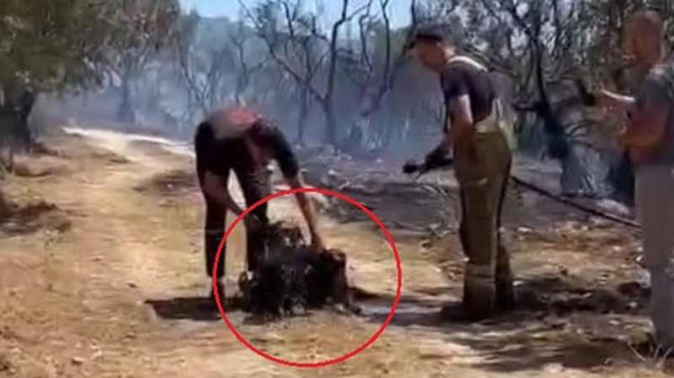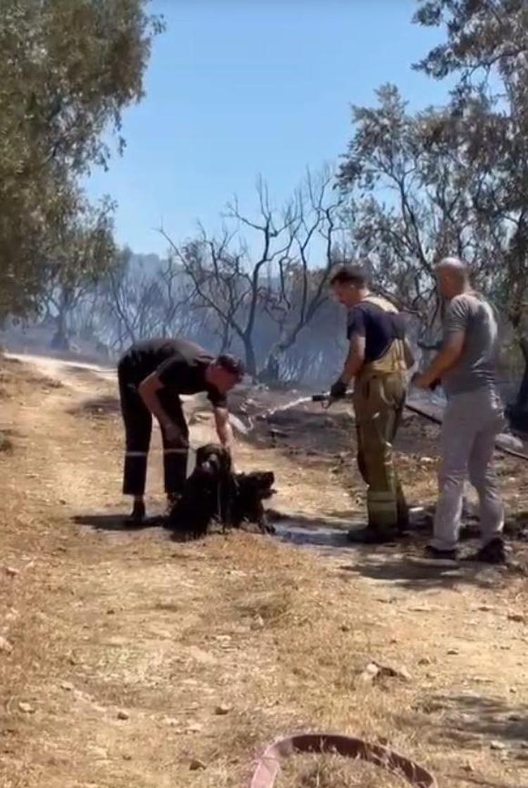 Bursa Büyükşehir Belediyesi İtfaiye Daire Başkanlığı ekipleri, köpeklere ilk müdahaleyi hortumla su sıkarak yaptı. Cep telefonu kamerasına yansıyan o anlar, bir itfaiyeci tarafından sosyal medya hesabından, “Yangın söndürmek görevimiz ama asli görevimiz canlıları korumak” mesajıyla paylaşıldı.
