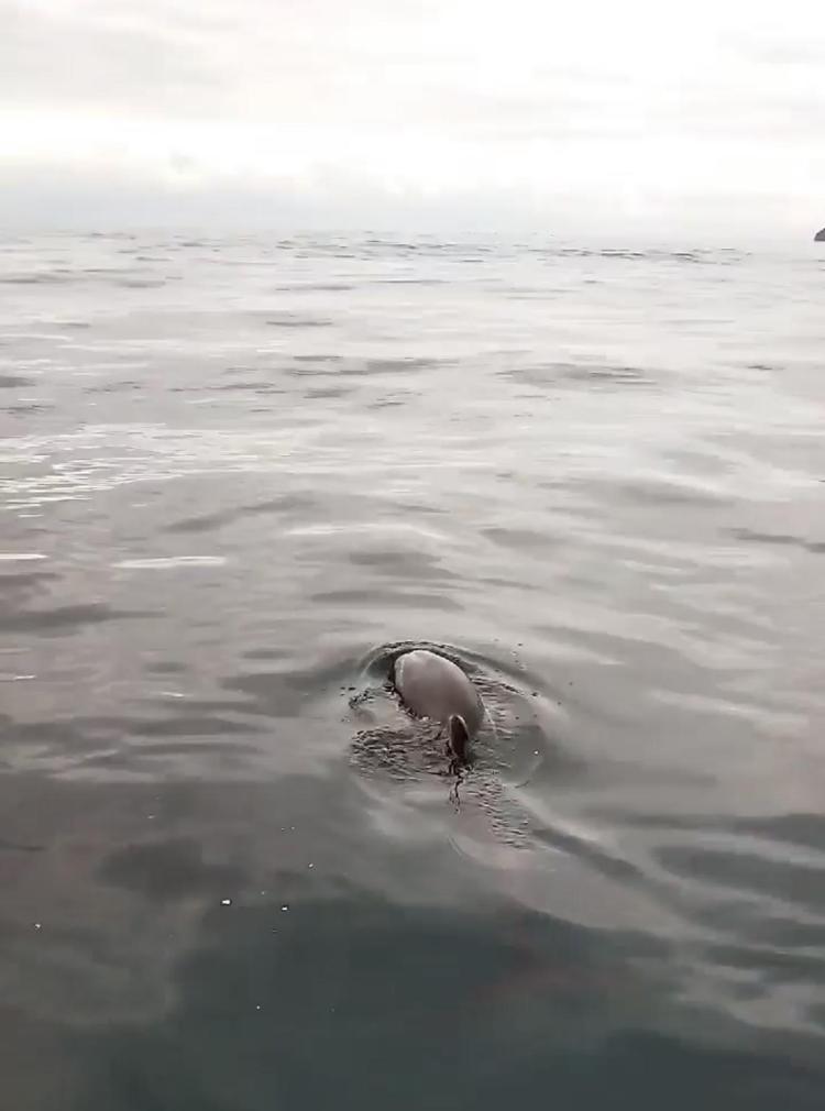 Yanına yaklaşan yunusu ekmek ve domatesle besledi