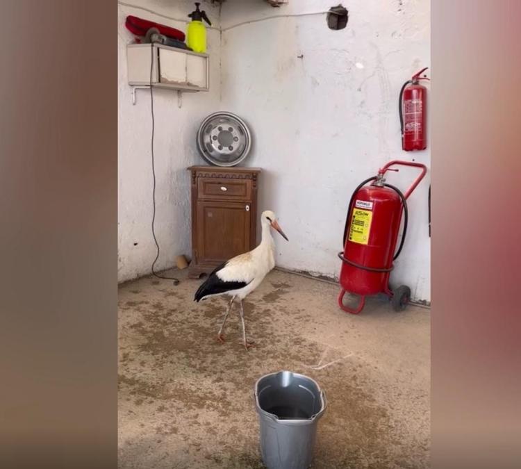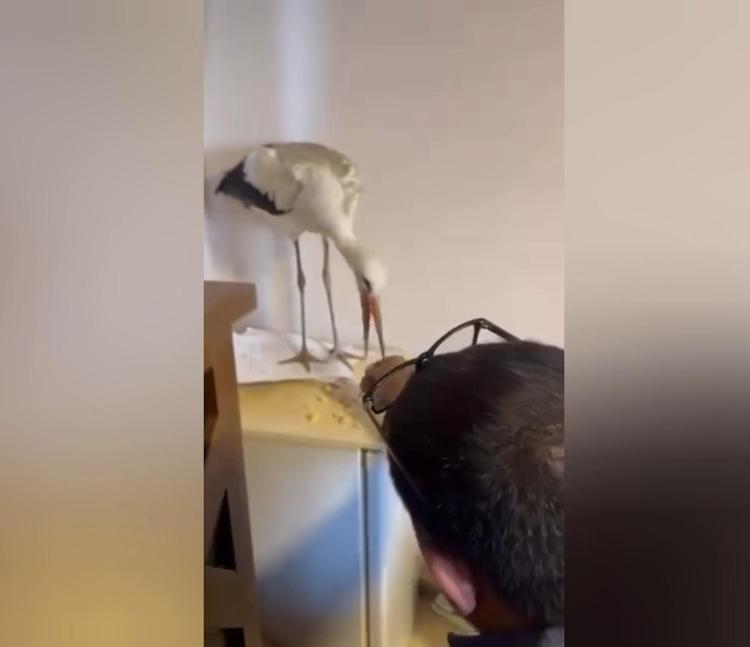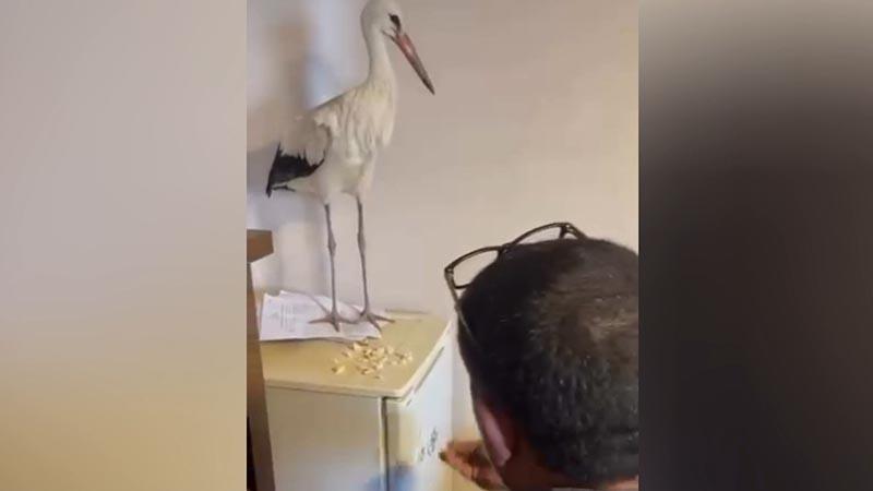 Yaralı leyleği sığındığı iş yerinde elleriyle besledi