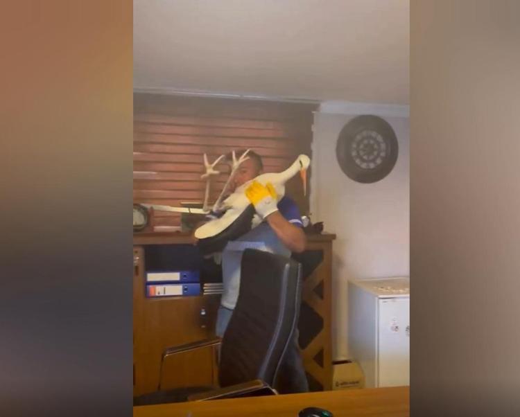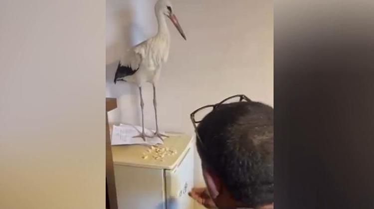 Ofisin içinde gezen, mini buzdolabının üstünde ekmek yiyen leylek, cep telefonu kamerasıyla görüntülendi. Yaralı leylek, ihbarla, otoparka gelen İnegöl Belediyesi Sahipsiz Hayvan Bakım ve Tedavi Merkezi ekiplerine teslim edildi.