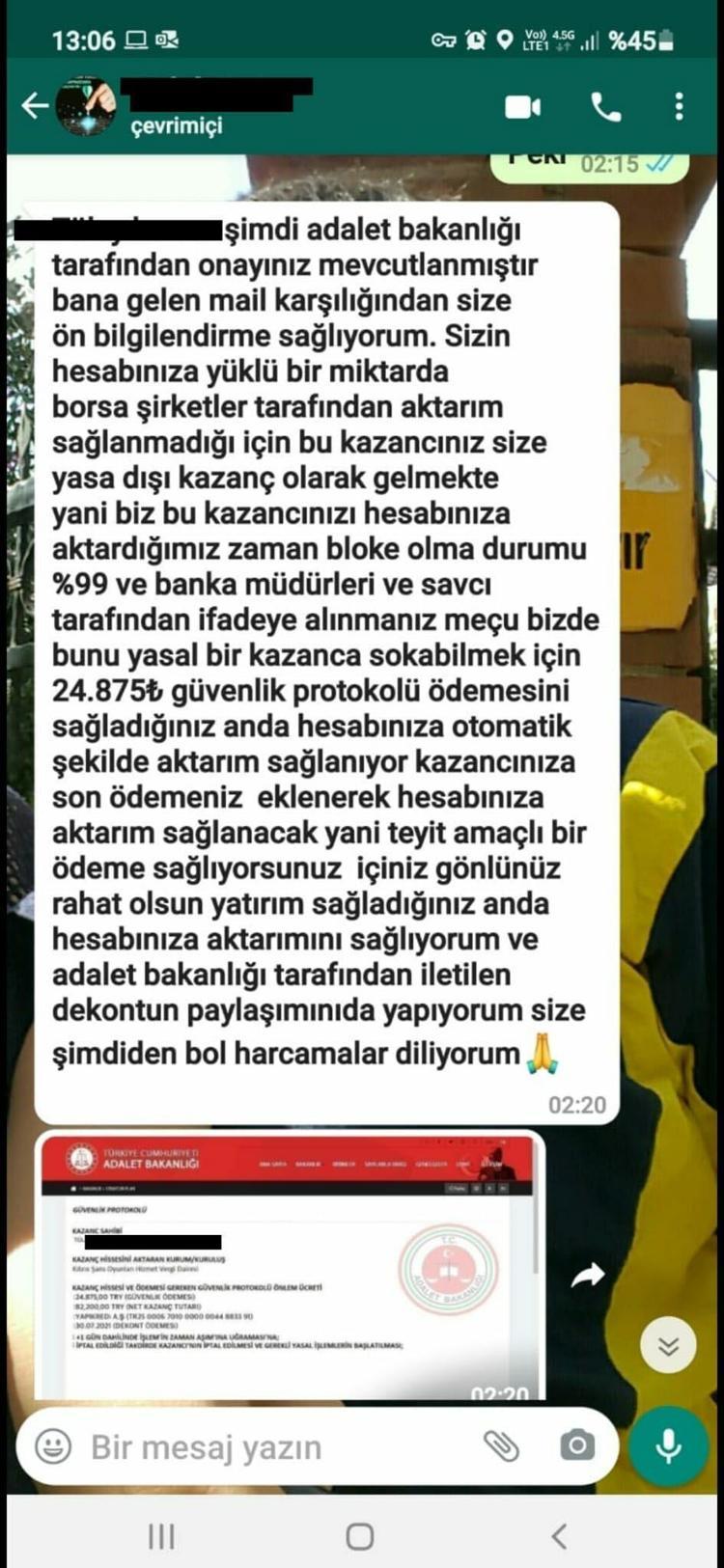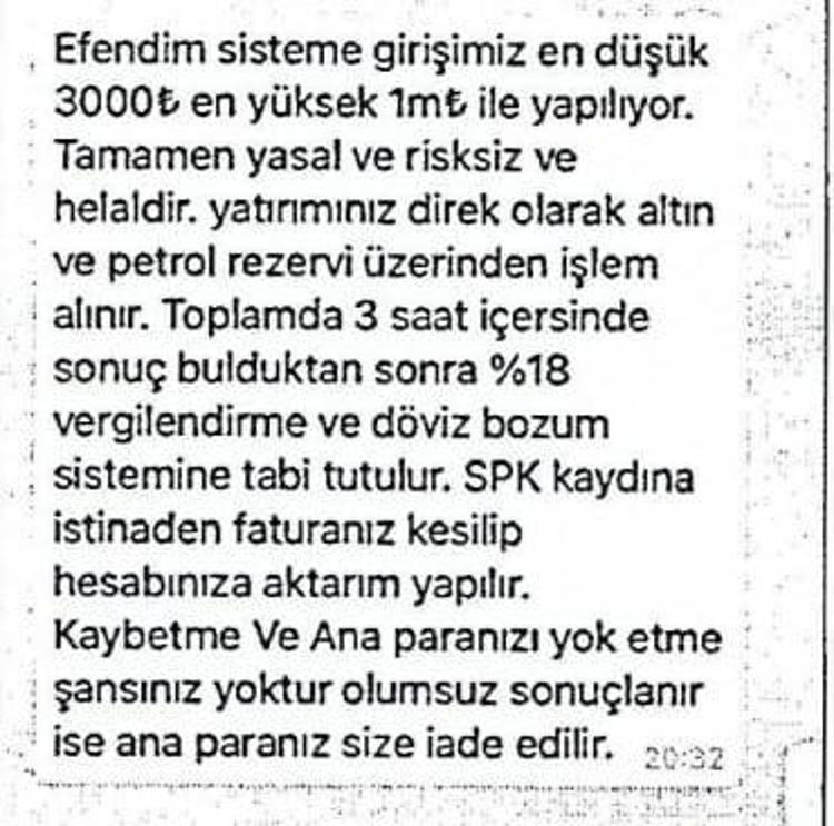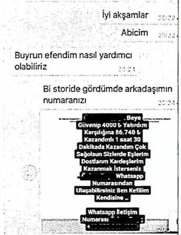 Kendi arkadaşıyla konuştuğunu sanan mağdurların da dolandırıldığı belirlendi. Ortaya çıkan mesajlarda ise şebeke üyelerinin, sisteme en az 3 bin lirayla giriş yapıldığını, bu sistemin 'yasal, risksiz ve helal' olduğunu söylediği ifade edildi. Suç örgütü üyelerinin, dolandırdıkları kişilere ana parayı kaybetmeme taahhüdü verdiği de belirtildi. Bunların yanı sıra sözde kazanılan paraların bloke olmaması için mağdurlardan 'güvenlik protokolü' adı altında yeniden ödeme yapmaları istendiği de ortaya çıktı. Dolandırıcıların, bu ödeme yapıldıktan sonra Adalet Bakanlığı sayfasından düzenledikleri sahte ekran görüntülerini vatandaşlara gönderdikleri kaydedildi. Devlet bankalarına ait olduğu ileri sürülen çok sayıda belgeyi de mağdurlara gönderdikleri aktarıldı.