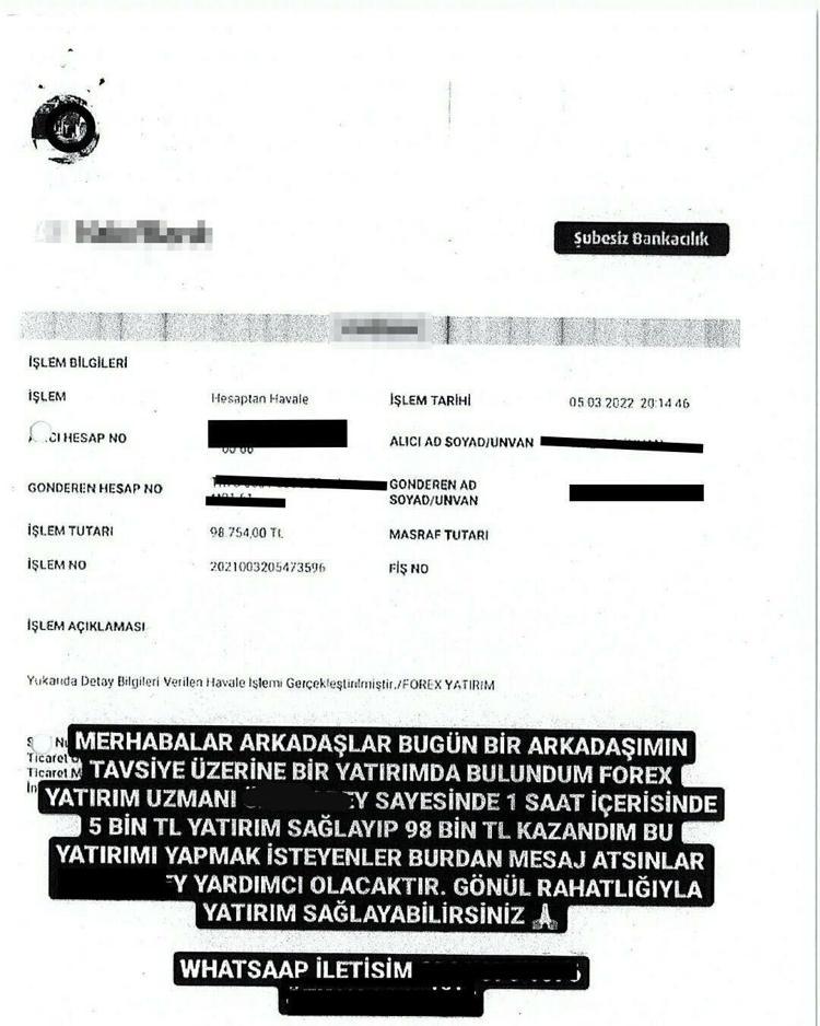İzmir Cumhuriyet Başsavcılığı tarafından başlatılan soruşturma kapsamında 19 şüphelinin, ele geçirdikleri sosyal medya hesaplarından yüksek kazançlı 'forex' yatırımıyla ilgili paylaşımlarda bulundukları, hesaplarda ekli kişilerin güvenini kazanıp kendileriyle iletişime geçenlerden yüksek kazanç vaadiyle yatırım danışmanlığı ücreti adı altında para talep ettikleri ve bu kişilere yüksek para kazandıkları yönünde sahte dekontlar düzenledikleri, kazanılan parayı alabilmeleri için vergi, dosya masrafı adı altında ücret aldıkları ve işlemlerin legal olduğuna inandırmak için Adalet Bakanlığı'nın resmi kurum logosunu ve sitesine ait ekran resimlerinin bulunduğu çeşitli belge ve resim göndererek dolandırıcılık yaptıkları tespit edildi.