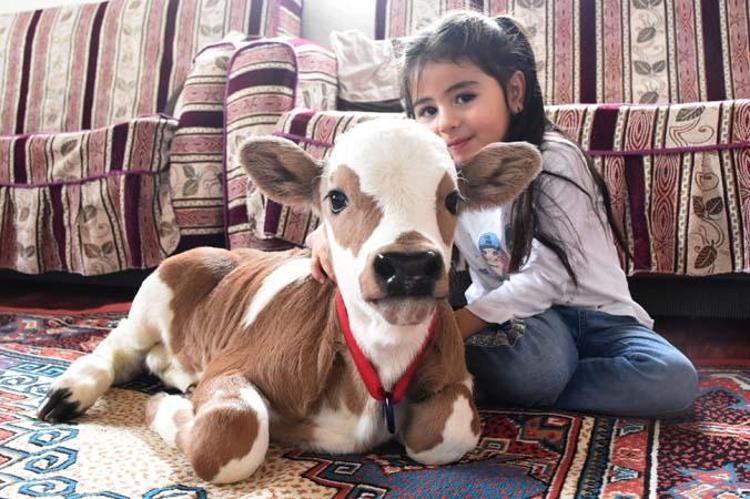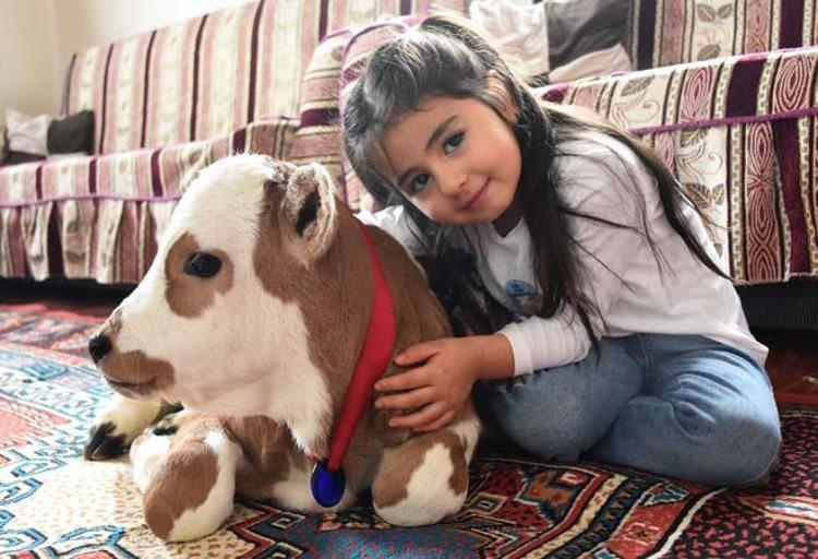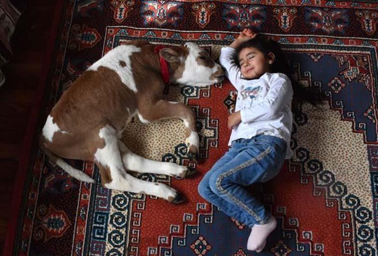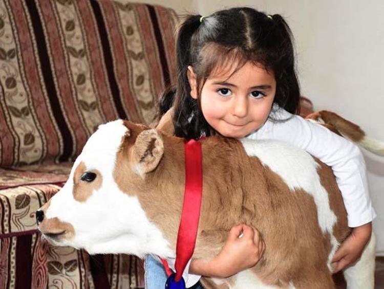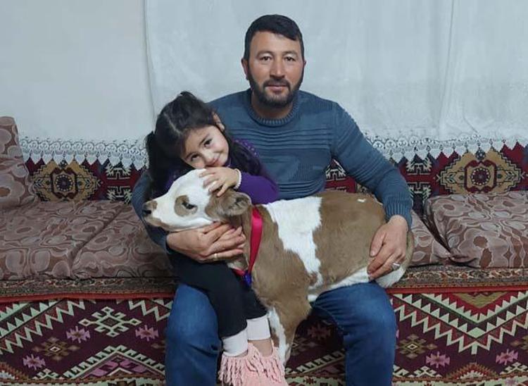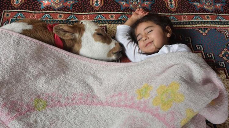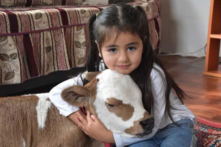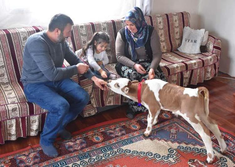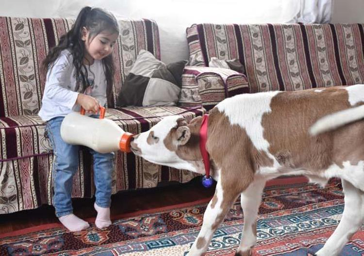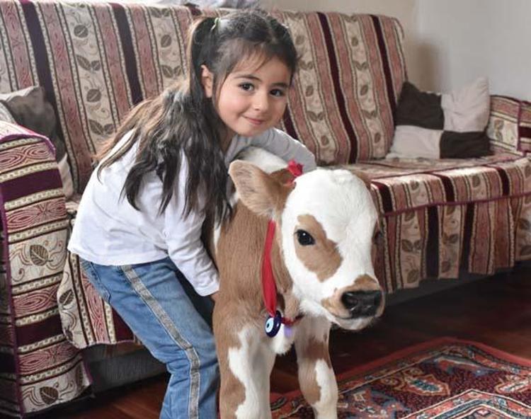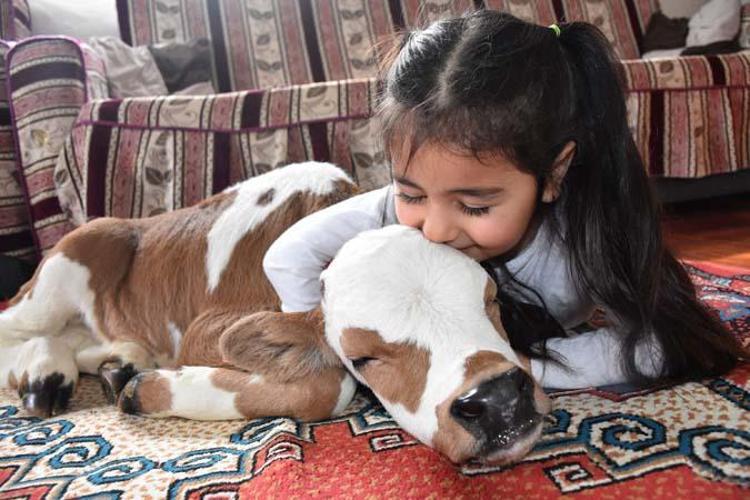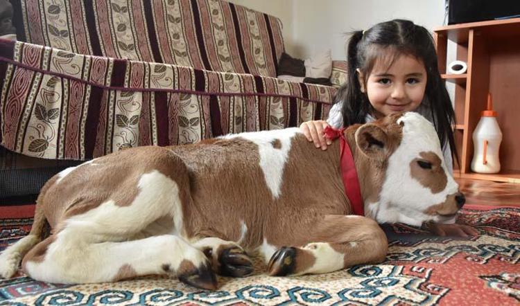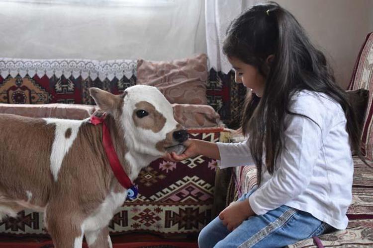 Sivas'ın Hafik ilçesine bağlı Sofular köyünün muhtarı Fatih Yıldırım, (43) erken doğum yapan ineğinin buzağısına evde bakmaya başladı. Yıldırım’ın kızı 5 yaşındaki Hiranur’un 'Benekli' adını verip yakından ilgilendiği buzağı, kısa sürede toparlanıp ayağa kalktı. Hiranur’un uyurken bile yanından ayrılmadığı buzağı, gelişimini sürdürüyor.