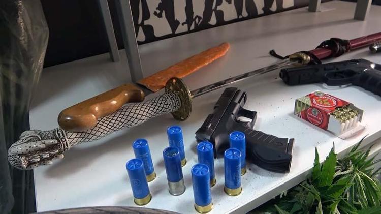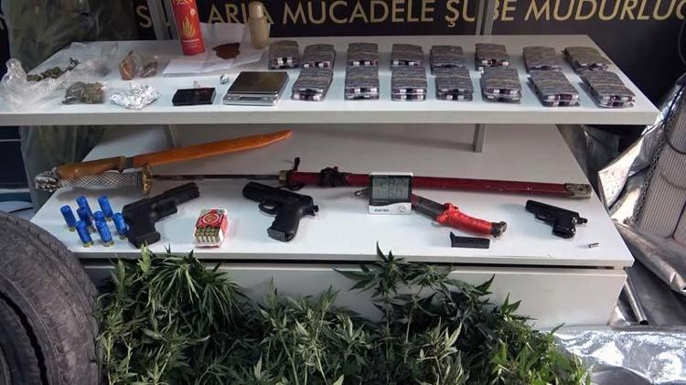 Adreslerdeki aramalarda uyuşturucunun yanı sıra ruhsatsız 3 tabanca, 1 samuray kılıcı ve 1 pala ele geçirildi.