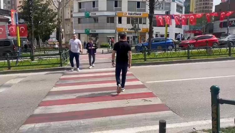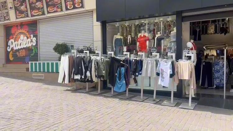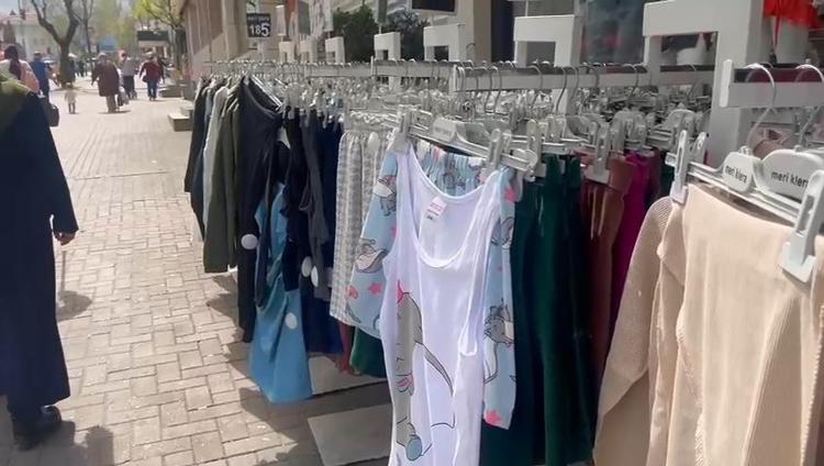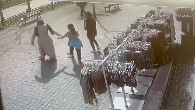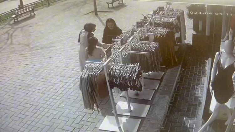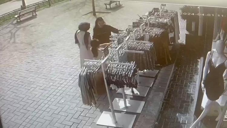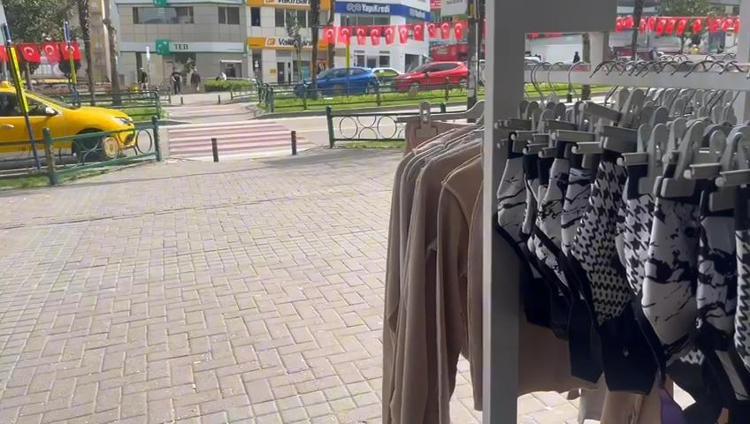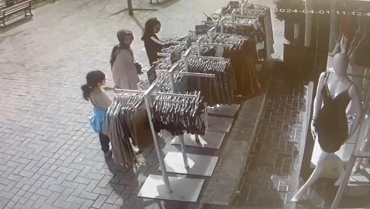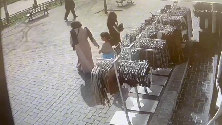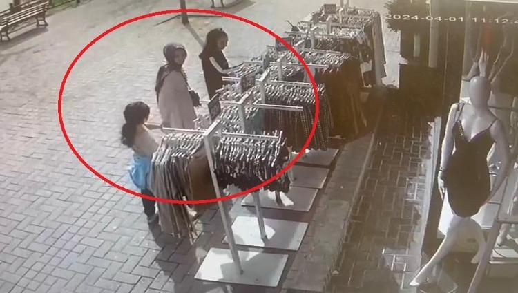Görüntülerde sohbet eden anne ile kızlarının, mağazanın önünde askıda duran kıyafetleri incelediği ve ardından da el ele tutuşup yaya geçidine yürüdükleri görülüyor.