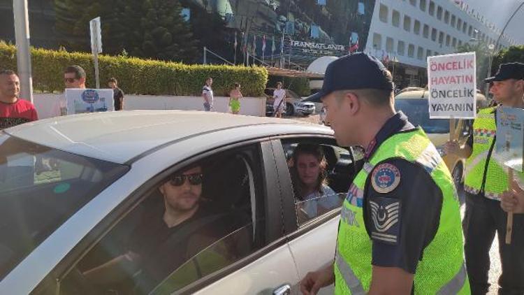 Antalya'nın Kemer ilçesinde jandarma trafik ekipleri, 'Öncelik Hayatın, Öncelik Yayanın' projesi kapsamında farkındalık etkinliği düzenledi. Yaya geçidinde durup yayaya yol veren sürücülerin bir anda karşısına çıkan jandarma ekipleri ve vatandaşlar, sürücüleri alkışlayıp hediye verdi.